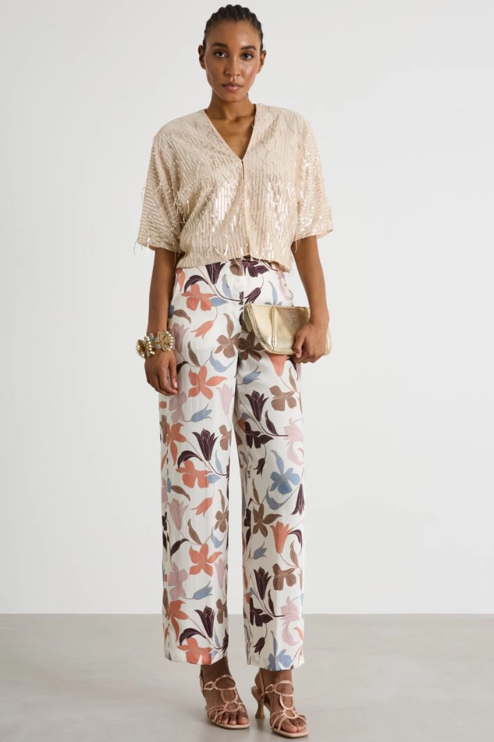 Coprispalle dalla linea dritta in tessuto tecnico con strass, scollo a V e maniche a tre quarti. Chiusura con ganci.