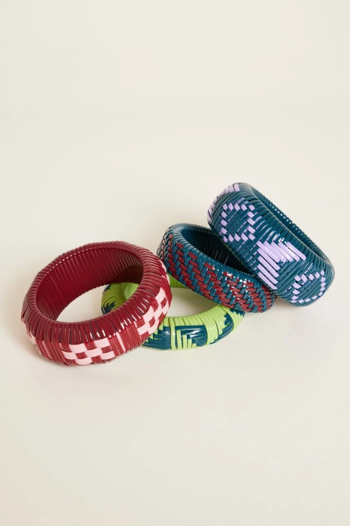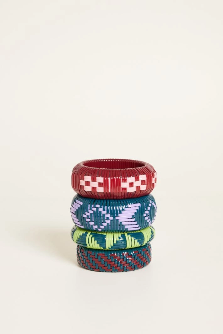 Set di bracciali rigidi in resina intrecciata con motivi grafici a contrasto.