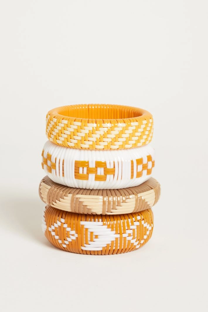 Set di bracciali rigidi in resina intrecciata con motivi grafici a contrasto.