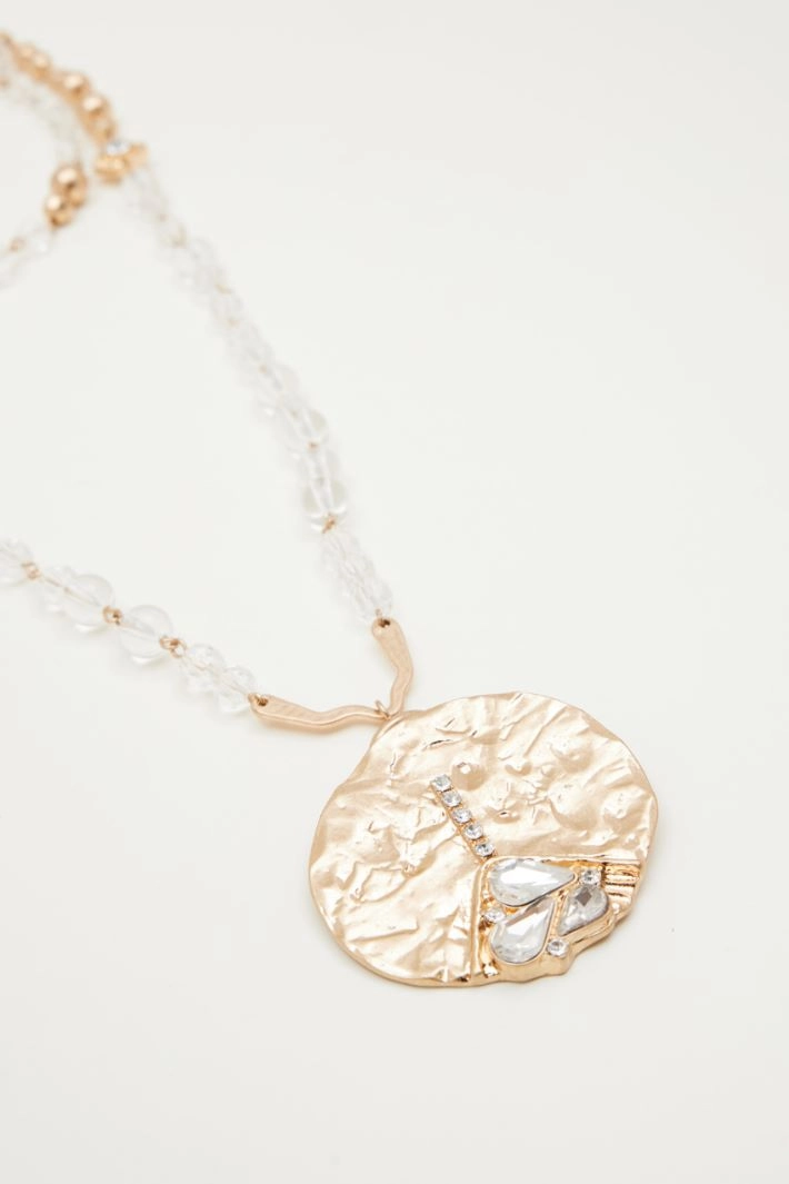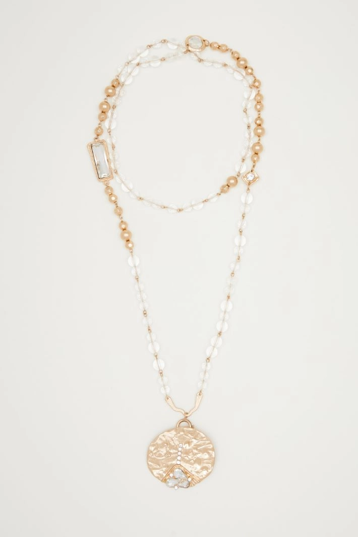 Collana lunga a doppio giro composta da elementi in metallo e resina. Ciondolo a forma di disco con dettagli in strass e cristalli.