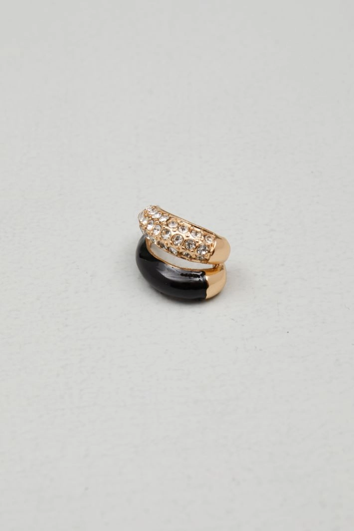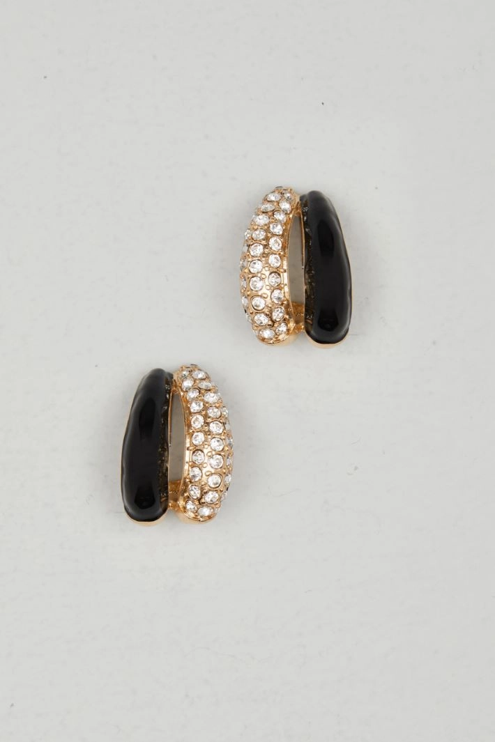 Orecchini a mezza luna realizzati in metallo, con strass incastonati in vetro e dettaglio smaltato. Chiusura a farfallina.