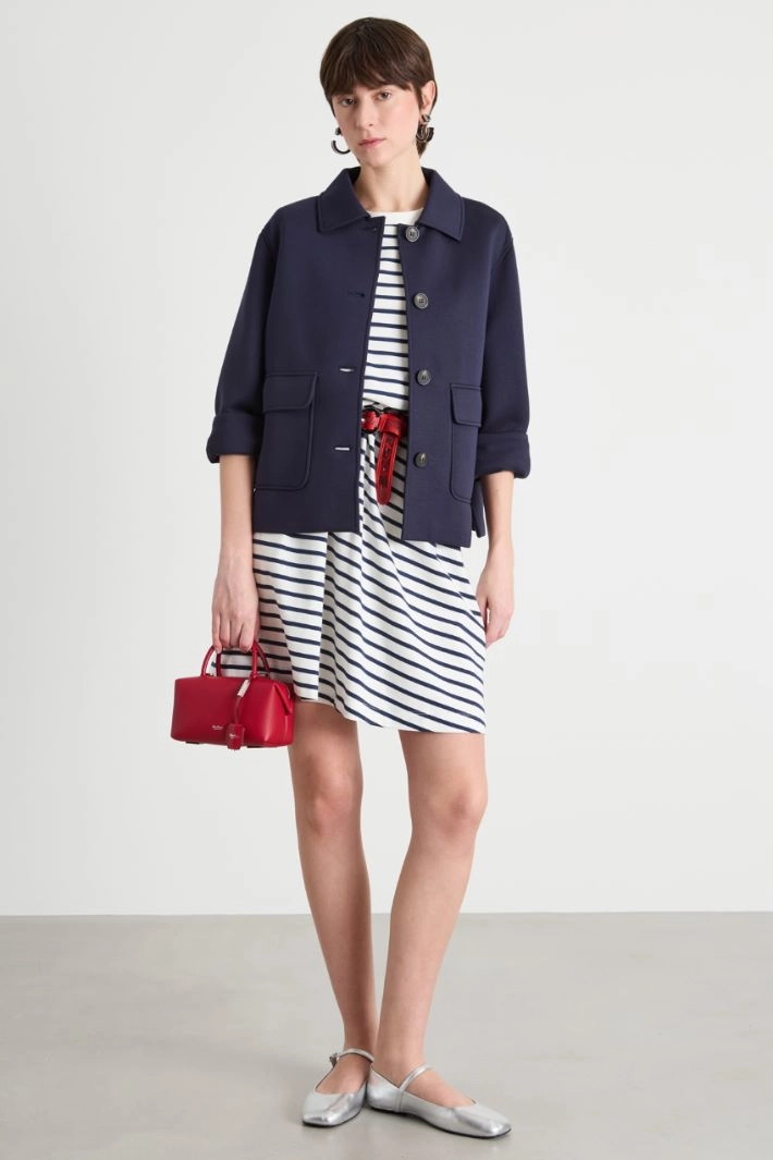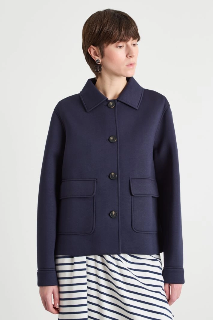 Giacca dalla linea boxy in doppio jersey tecnico di viscosa, con colletto a punta, maniche lunghe con polsini e bottoni e tasche con patta applicate sul davanti. Chiusura con bottoni.