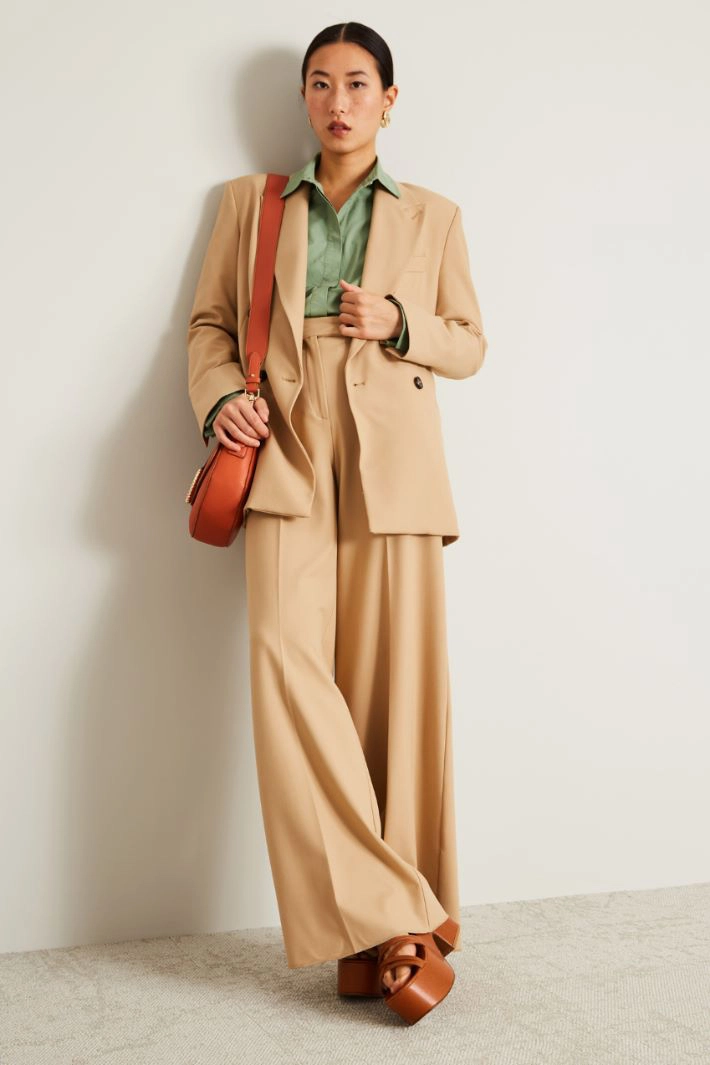 Blazer dalla linea dritta realizzato in levantina di misto viscosa stretch, con collo a rever, maniche lunghe tasche laterali a doppio filetto e spacco centrale nel retro. Allacciatura doppiopetto tramite bottoni. Capo foderato.