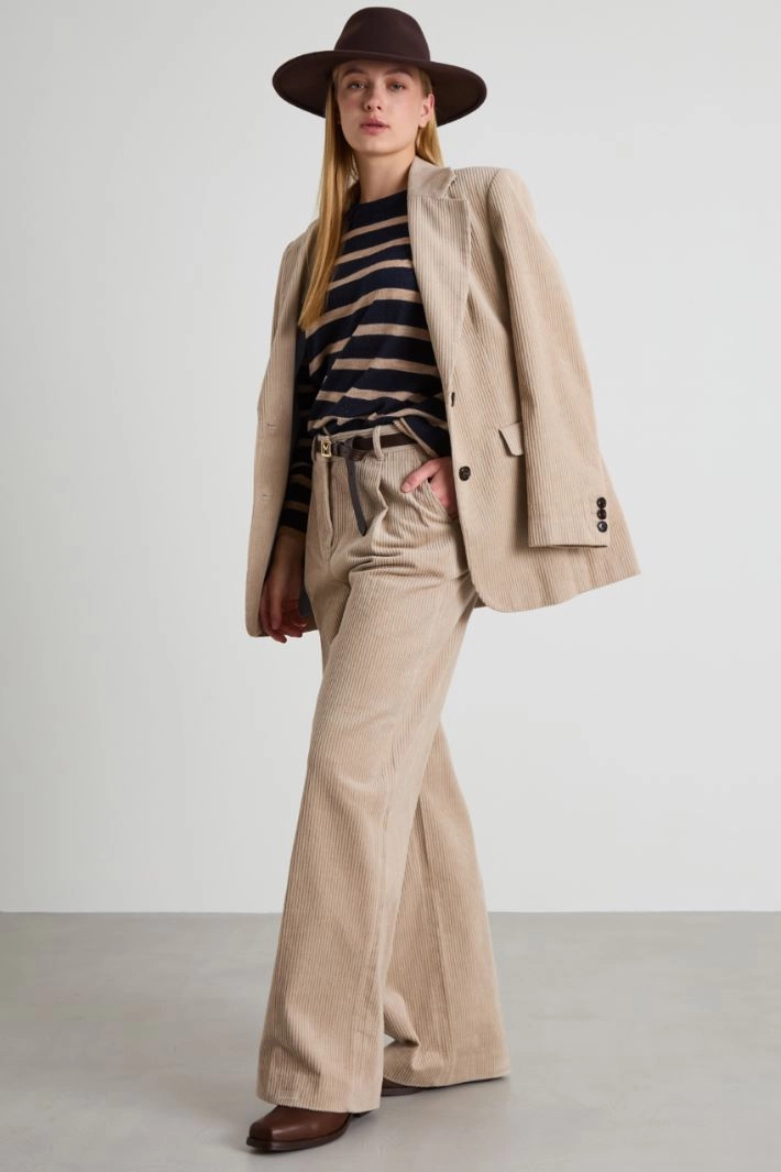 Pantaloni dalla linea ampia realizzati in velluto a coste di puro cotone, con pinces e passanti in vita, tasche alla francese davanti e a doppio filetto dietro. Allacciatura nascosta tramite zip, bottone e gancio.