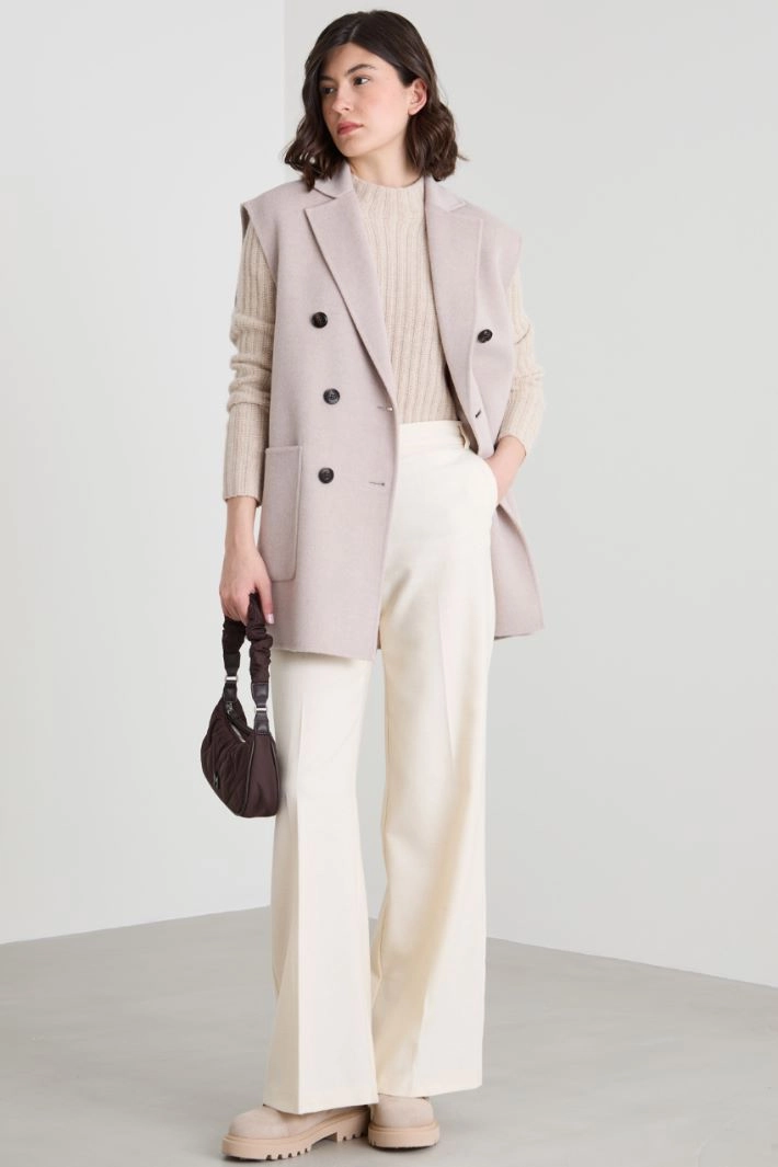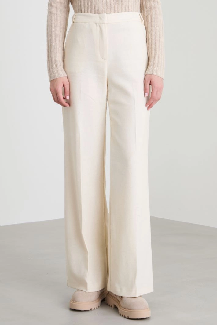 Pantaloni dalla linea dritta e morbida realizzati in tessuto diagonale di misto cotone e lana, con passanti in vita, tasche laterali alla francese e a filetto nel retro, e piega stirata in lunghezza. Allacciatura nascosta tarmite zip, bttone e gancio.
