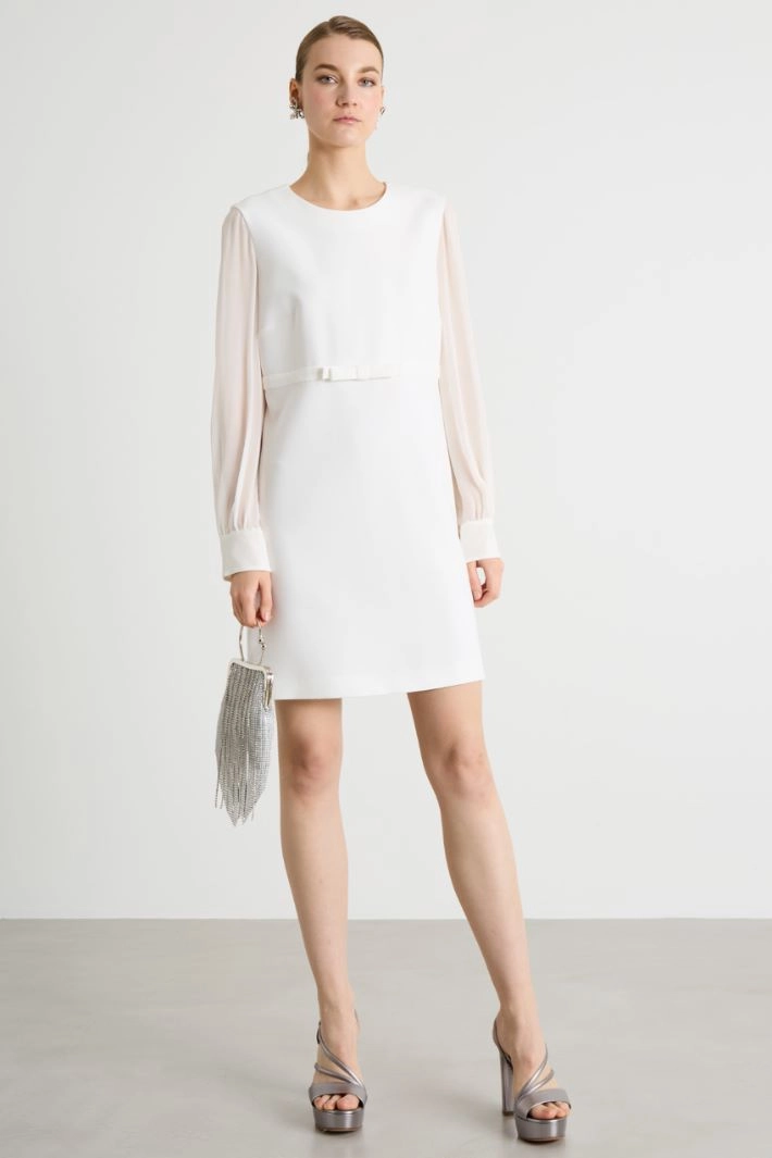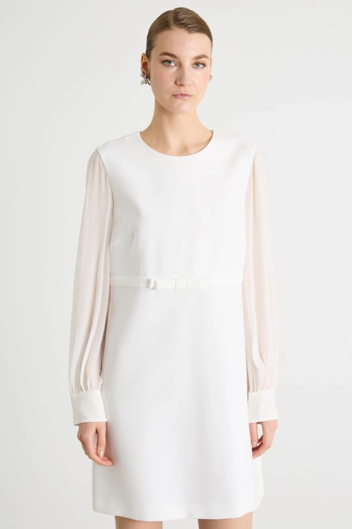 Abito corto dalla linea svasata in cady con scollo tondo e maniche lunghe in leggera georgette di pura seta con polsini a camicia. Capo semifoderato. Chiusura con zip invisibile sul retro.