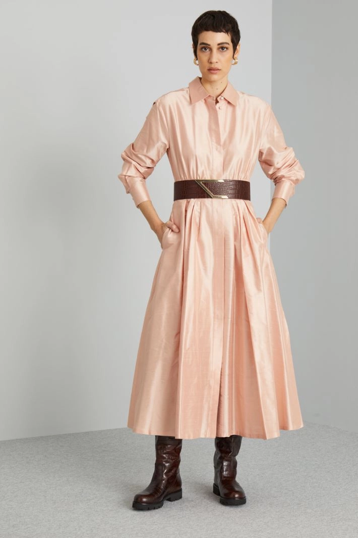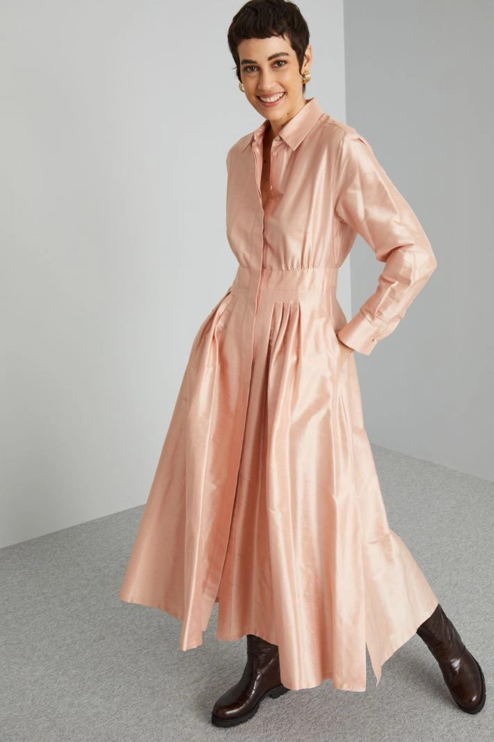 Chemisier lungo dalla linea regolare realizzato in shantung di pura seta, con colletto classico, maniche lunghe con polsino e bottone gioiello, cintone e motivo di pieghe cucite in vita, tasche laterali inserite in cucitura e spacchi al fondo. Allacciatura nascosta tramite bottoni.