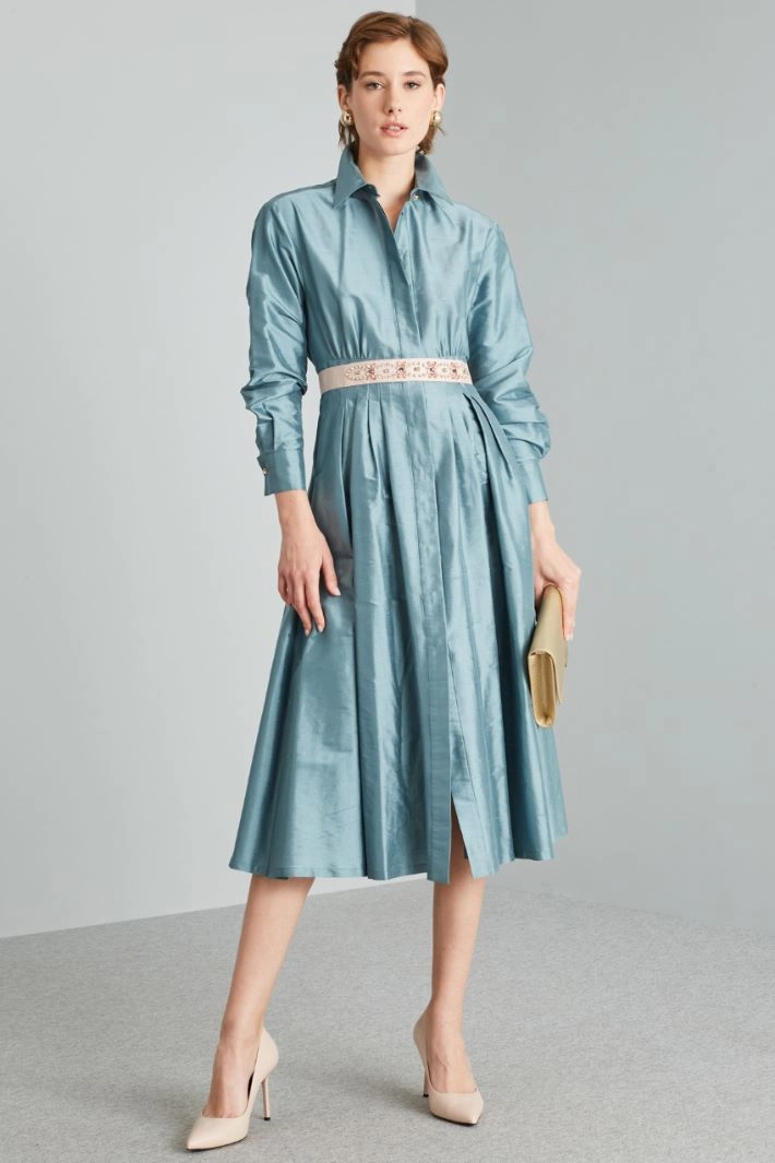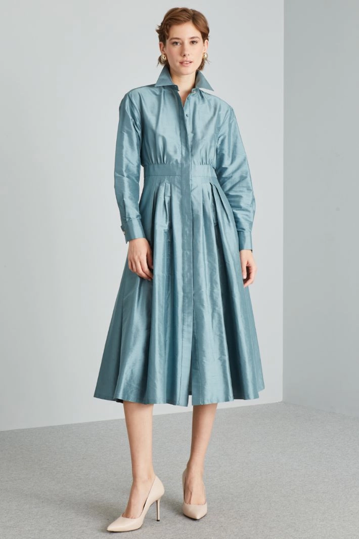 Chemisier lungo dalla linea regolare realizzato in shantung di pura seta, con colletto classico, maniche lunghe con polsino e bottone gioiello, cintone e motivo di pieghe cucite in vita, tasche laterali inserite in cucitura e spacchi al fondo. Allacciatura nascosta tramite bottoni.
