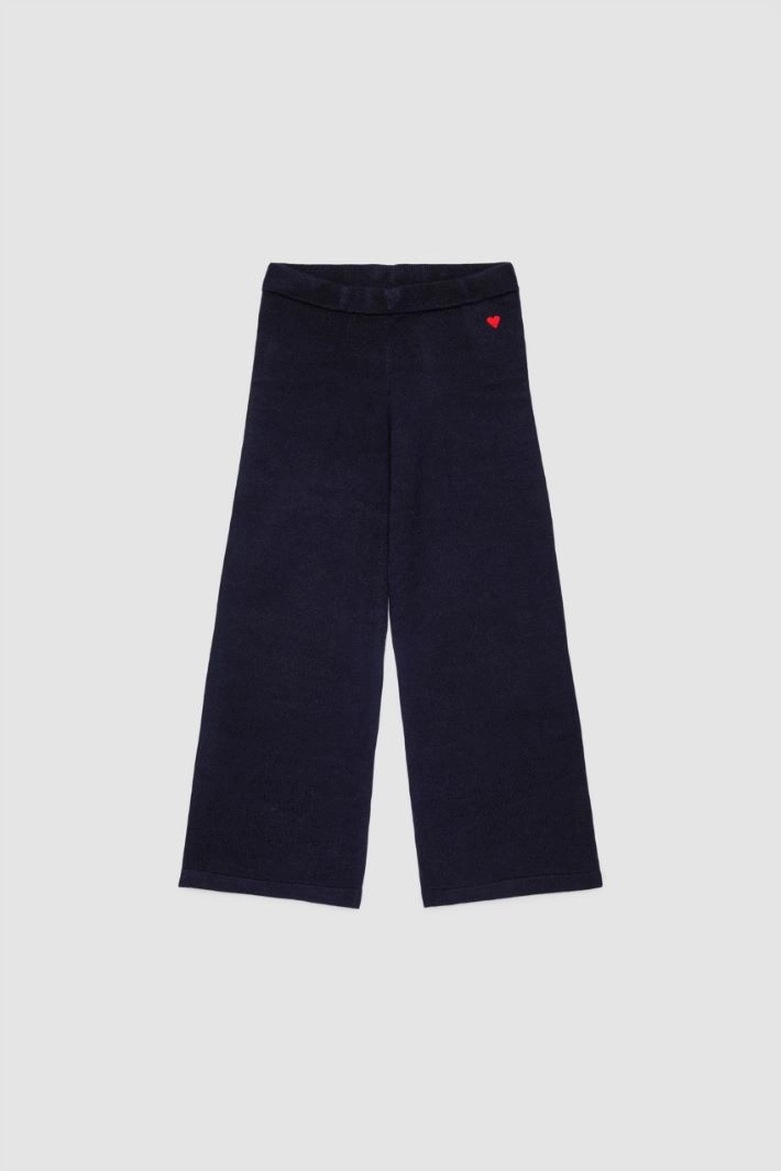 Pantaloni palazzo in maglia misto lana con elastico in vita. Lavorazione a costine. Ricamo cuore a contrasto sul davanti.