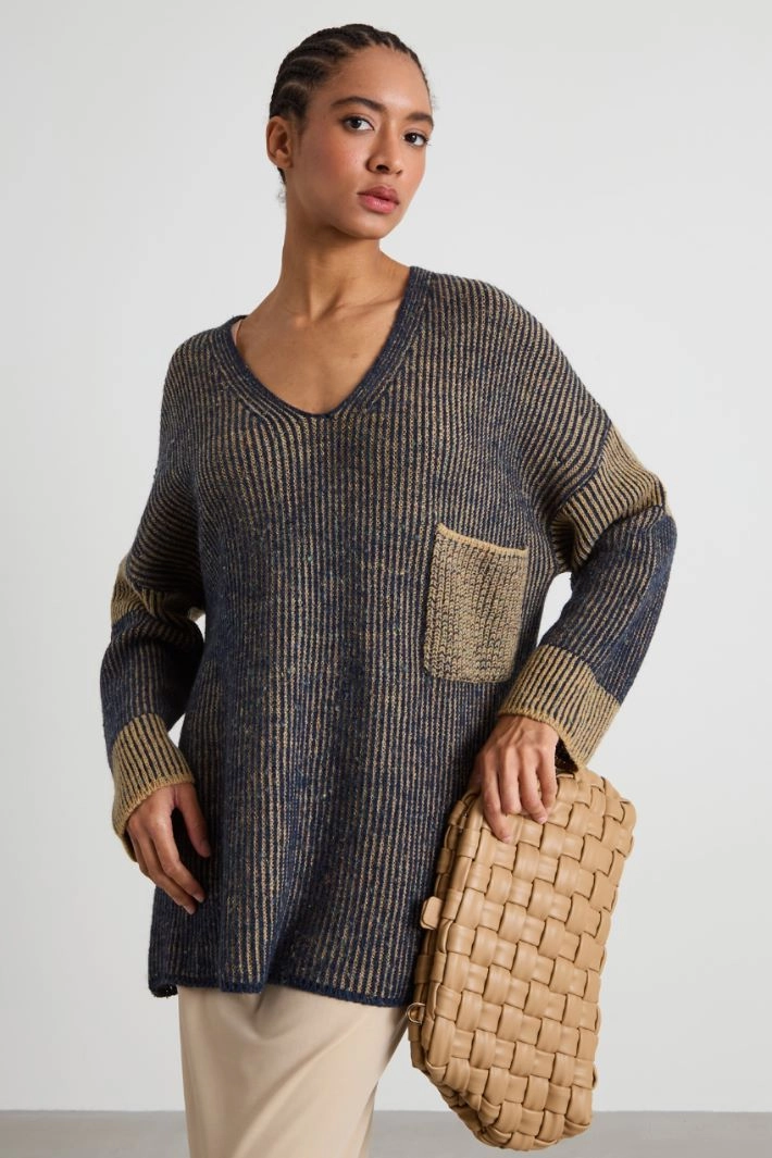 Maglia oversize dalla linea dritta realizzata in filato di misto lana con lavorazione bicolore, ampio scollo a V, maniche lunghe dal giro sceso e tasca applicata sul davanti.