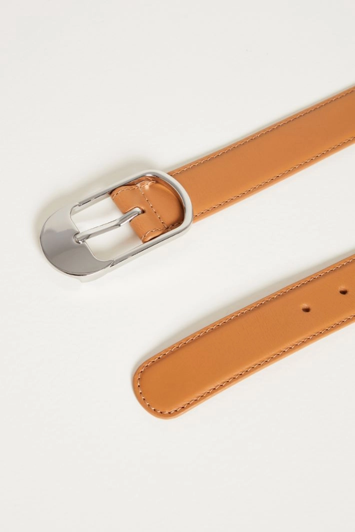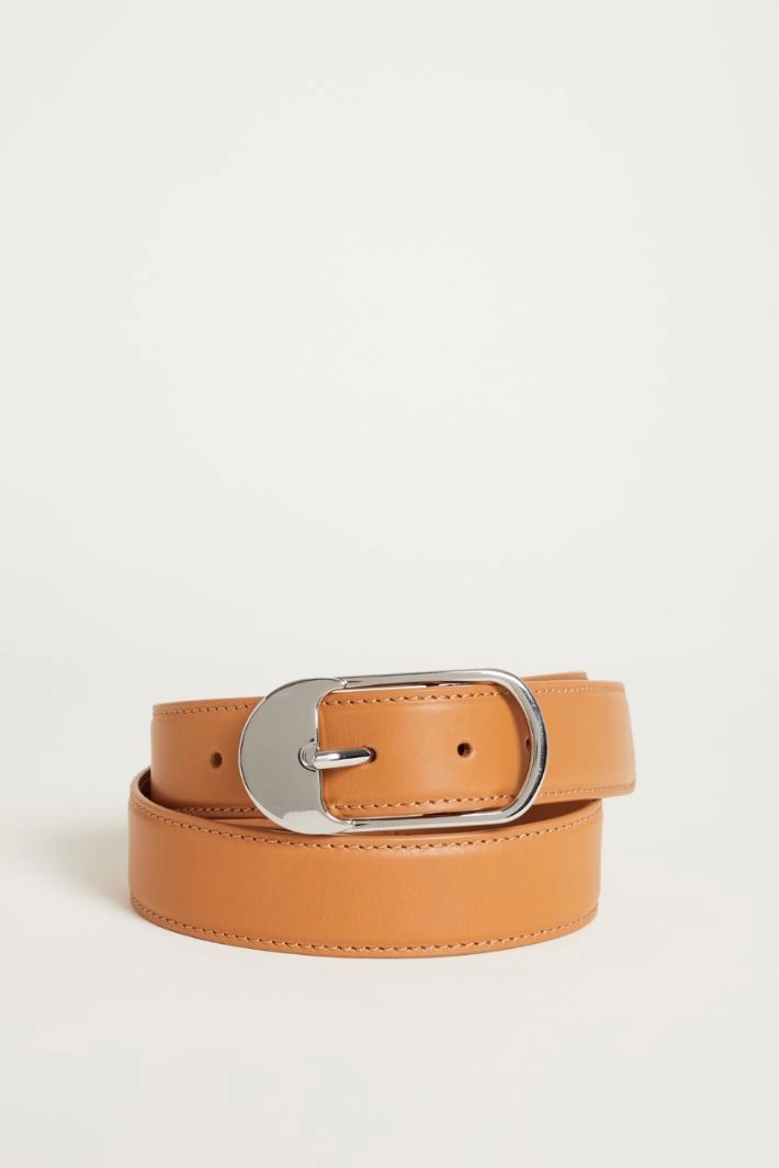 Cintura in pelle liscia con fibbia allungata a mezzaluna.