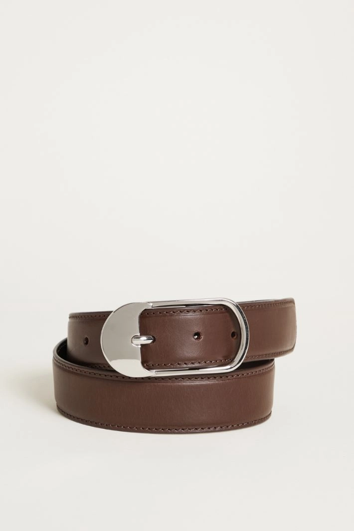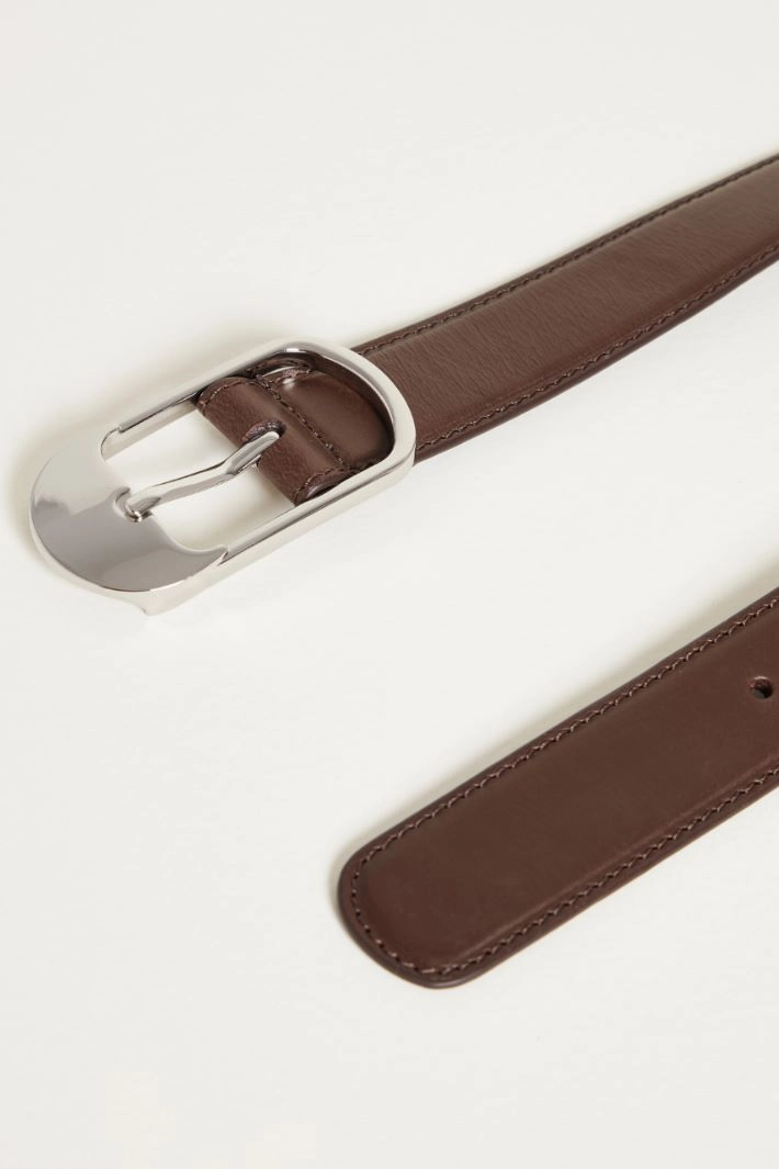Cintura in pelle liscia con fibbia allungata a mezzaluna.