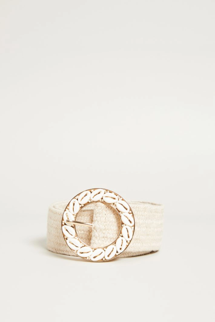 Cintura realizzata in rafia con ardiglione e fibbia con dettaglio.
