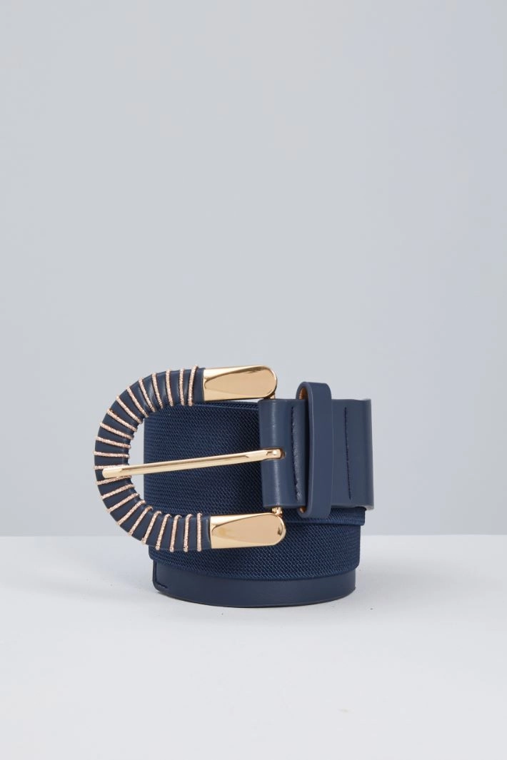 Cintura realizzata in tessuto elastico, con inserti in similpelle, maxi fibbia rivestita con motivo lamè e passante singolo.