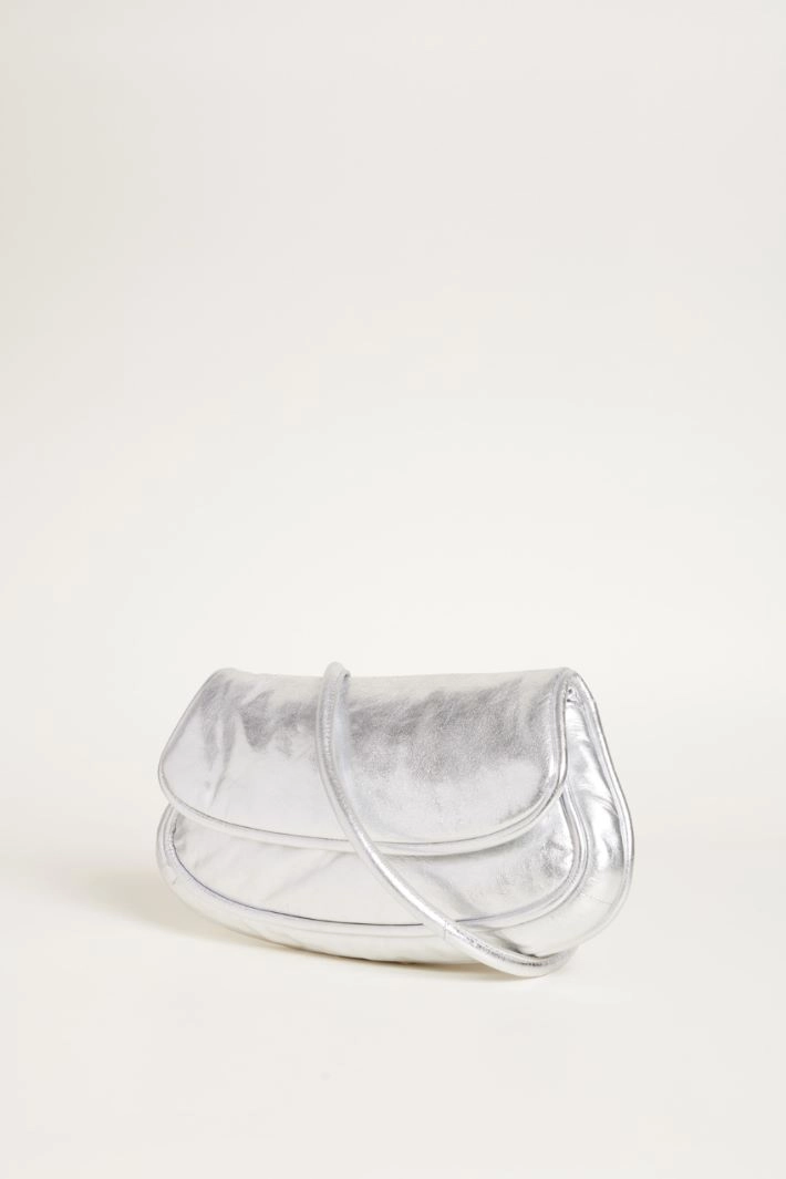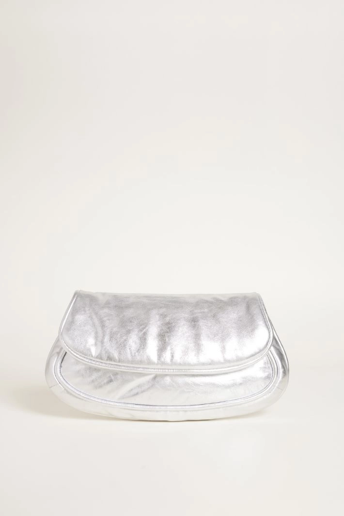 Pochette in pelle imbottita dotata di tracolla e profili in pelle liscia. Chiusura tramite patta.