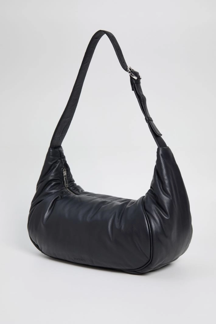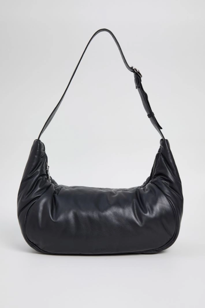 Maxi borsa imbottita realizzata in vera nappa, con manico singolo regolabile, profili rifiniti da piping in tono e chiusura con zip. Interno foderato con taschini.