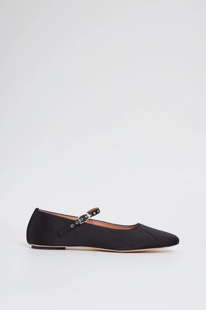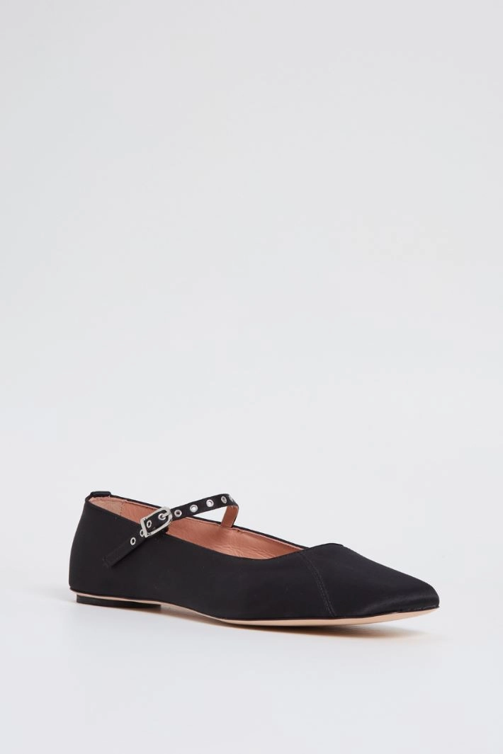 Ballerine realizzate in raso, con punta e scollo a trapezio, e cinturino sul collo del piede decorato da piccoli occhielli in metallo. Fodera e suola in pelle.