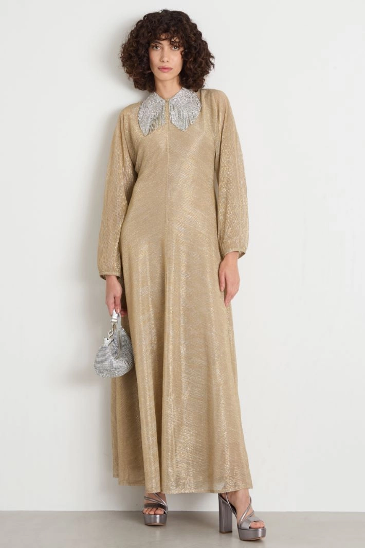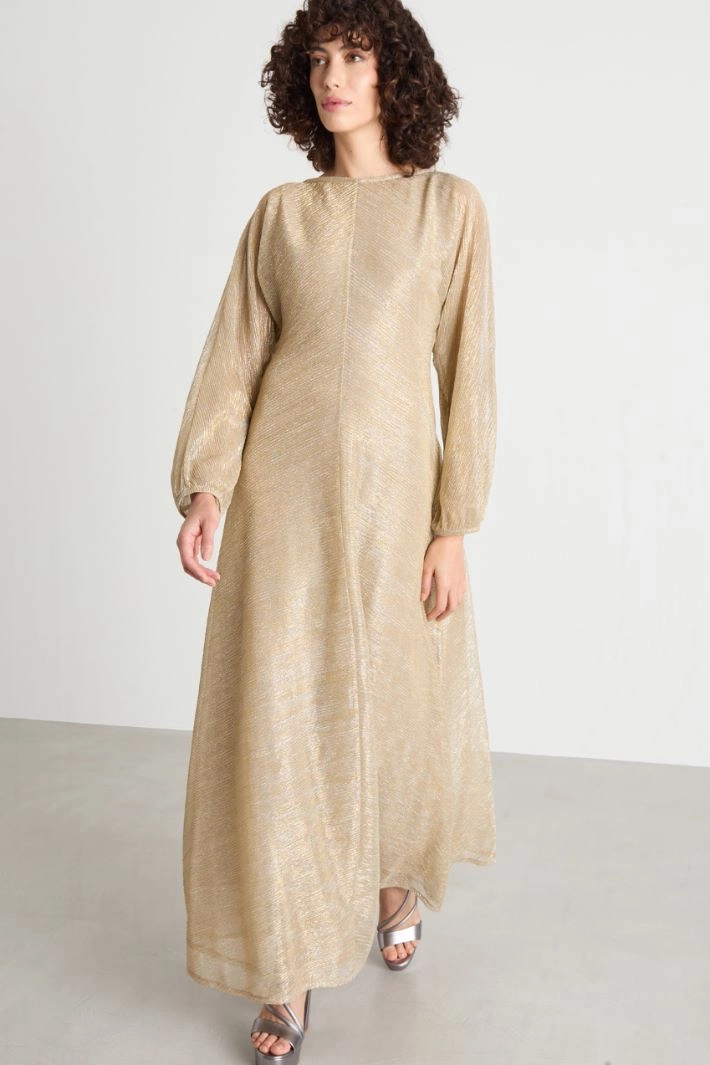 Abito dalla linea svasata in jersey laminato a doppio strato, lavorato a micro plissé, con scollo a barchetta, maniche lunghe a kimono, polsi elastici. Sottoveste in jersey.