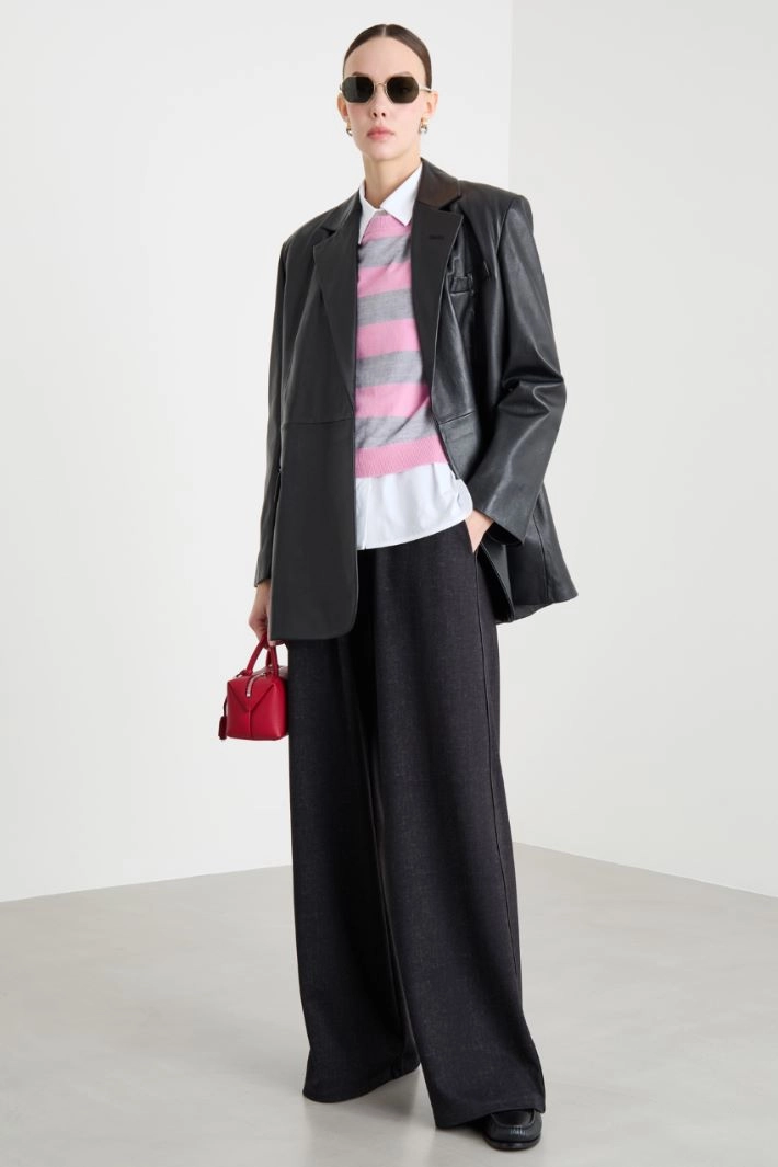 Pantalone stile joggers dalla linea ampia in jersey effetto délavé, con vita elastica dal finish spalmato provvista di coulisse e tasche alla francese.