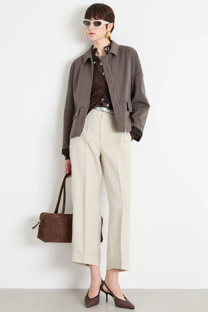 Giacca dalla linea boxy in jersey tecnico, con colletto a camicia, maniche lunghe, tasche con patta sul davanti e taglio cropped in vita. Chiusura con zip.