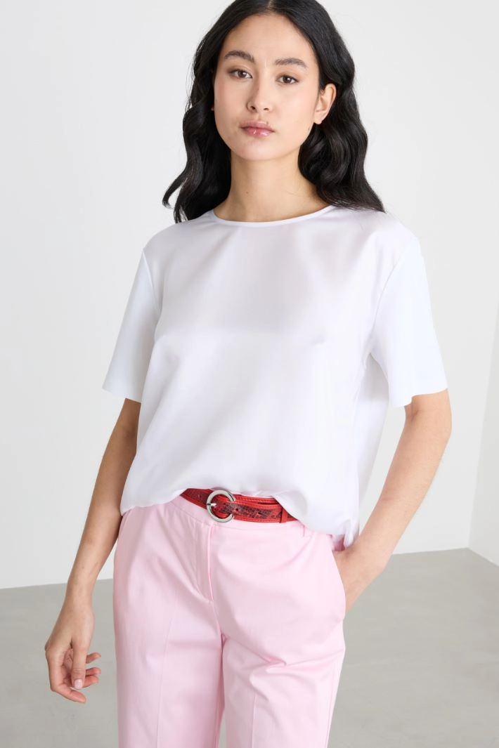 Top dalla linea dritta in jersey, con scollo tondo, maniche corte, inserto frontale in twill di pura seta. Fondo stondato con piccoli spacchi laterali.