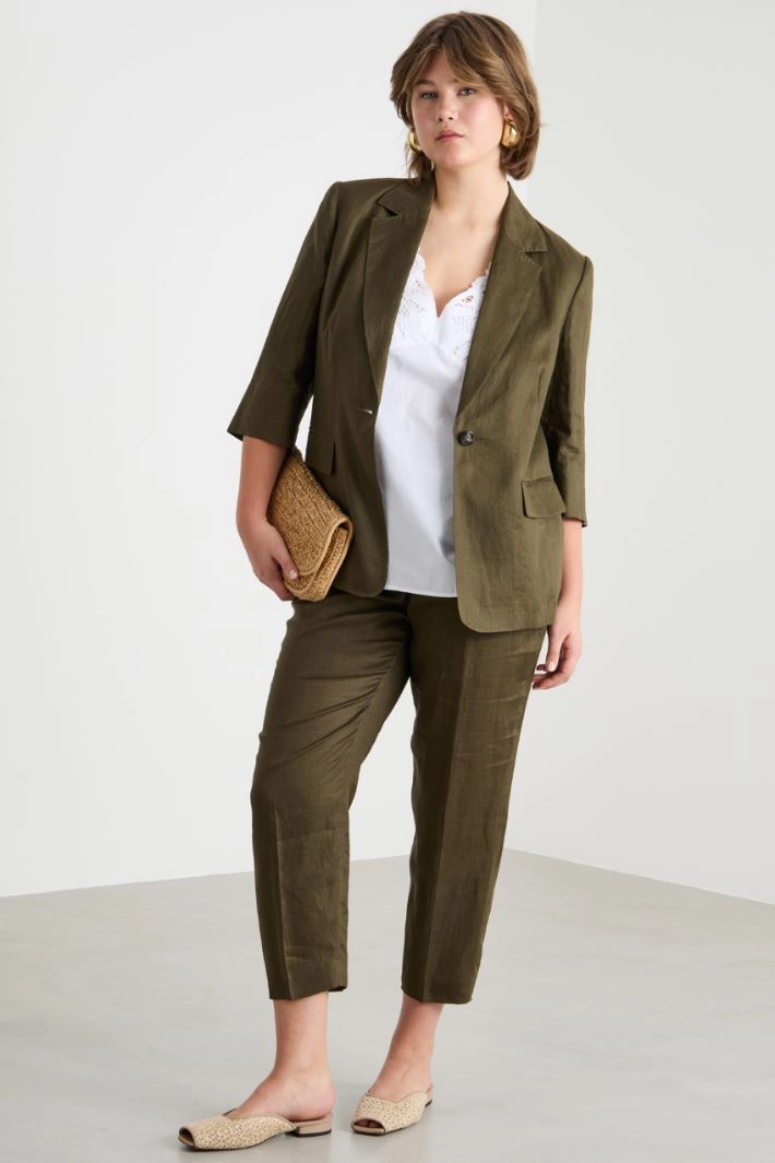 Blazer dalla linea aderente in tela di puro lino, con scollo a rever, maniche a tre quarti con spacco, tasche laterali con patta. Capo semifoderato. Chiusura con bottone.