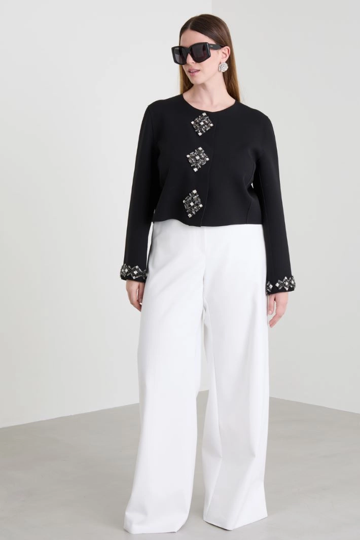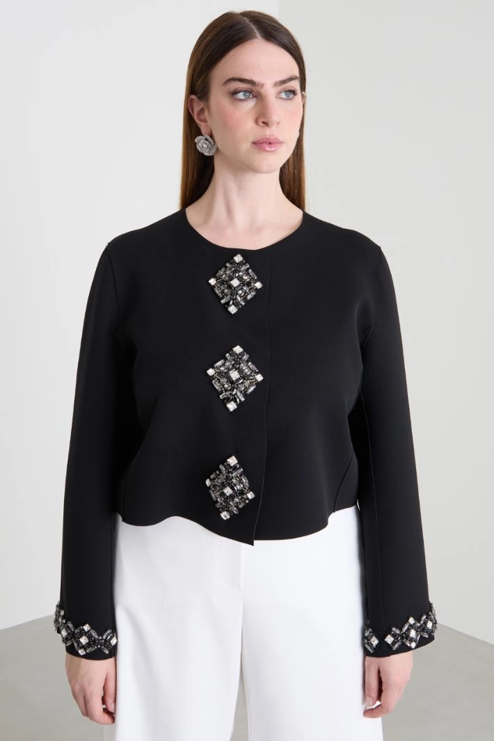Giacca dalla linea dritta realizzata in tessuto tecnico, con dettagli di strass ricamati, scollo a giro, maniche lunghe e profili tagliati a vivo. Allacciatura nascosta monopetto tramite bottoni automatici. Capo sfoderato.