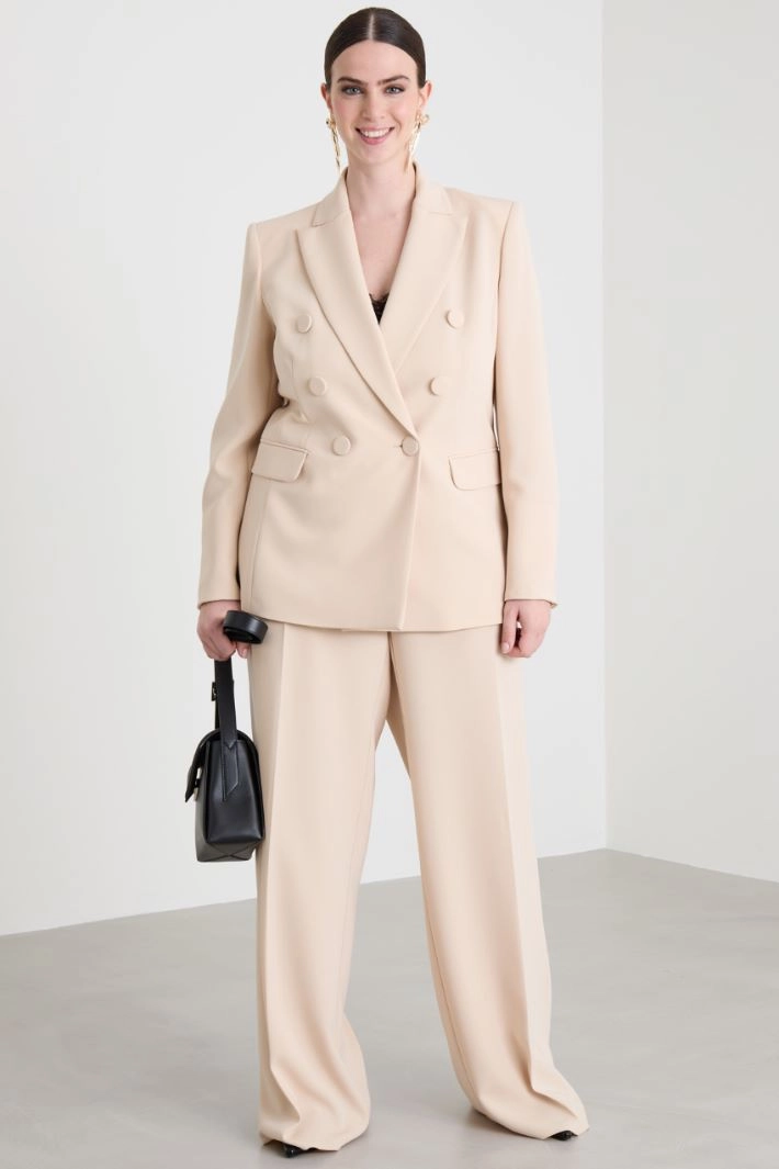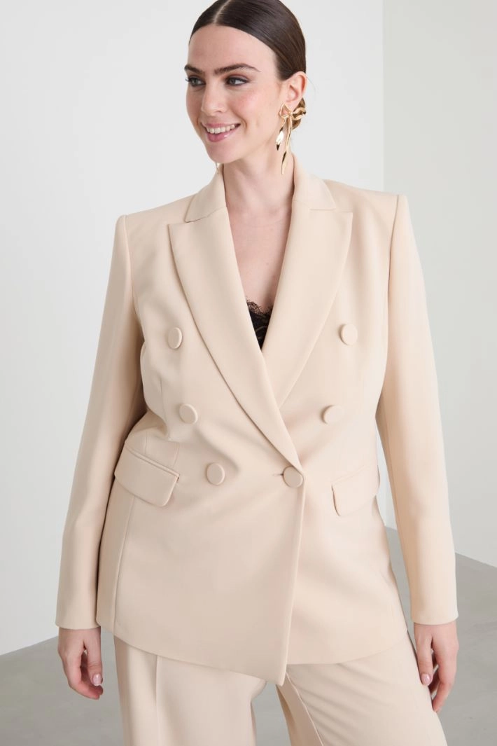 Blazer dalla linea leggermente sfiancata realizzato in cady, con collo a rever a lancia, spalline, maniche lunghe con bottoni ricoperti e tasche laterali a doppio filetto con patta. Allacciatura doppiopetto tramite bottoni. Capo foderato.