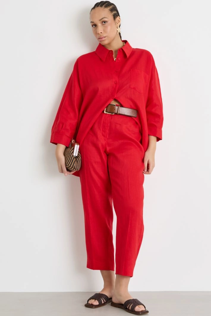 Camicia dalla linea ampia con colletto a punta, taschino al petto, maniche a tre quarti a kimono e spacchi laterali al fondo. Chiusura con bottoni.