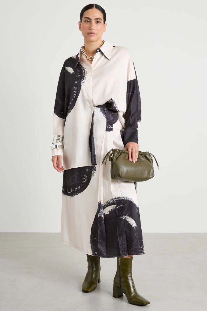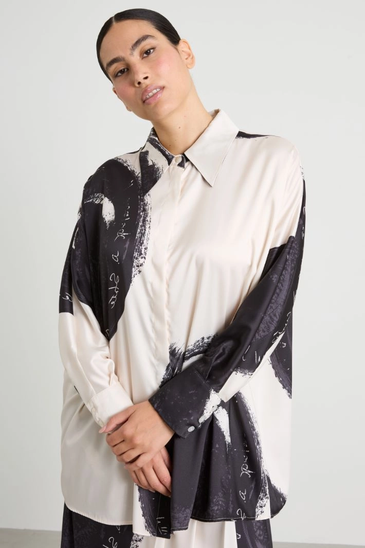 Camicia dalla linea dritta realizzata in twill stampato, con colletto classico, maniche lunghe con polsino e bottoni. Allacciatura nascosta tramite bottoni.