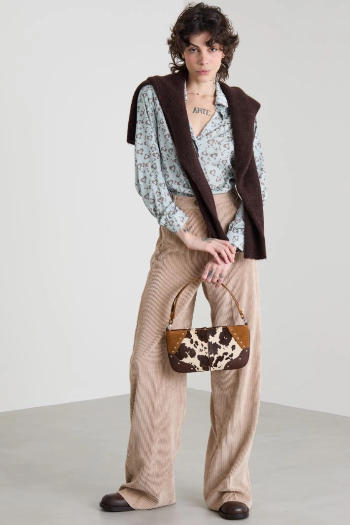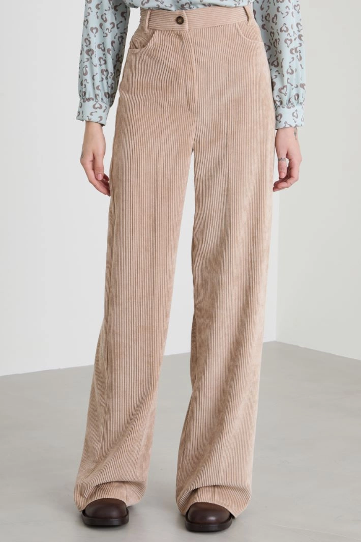 Pantaloni dalla linea dritta realizzati in velluto a coste stretch, con passanti in vita, tasche alla francese davanti e finte a filetto dietro. Allacciatura tramite zip nascosta e bottone.