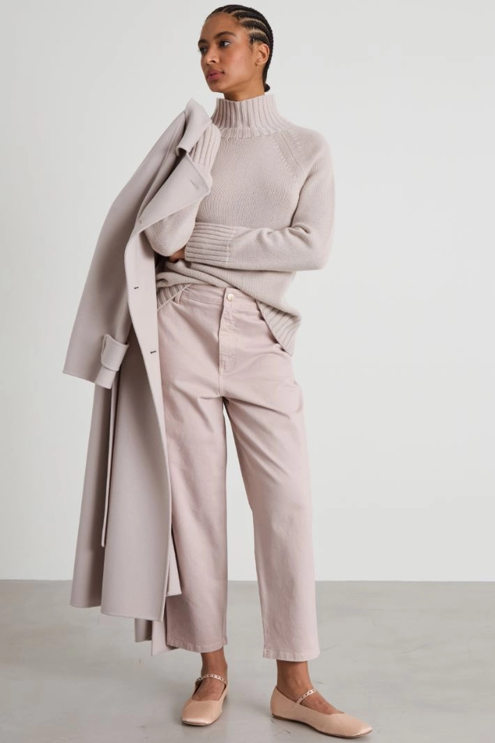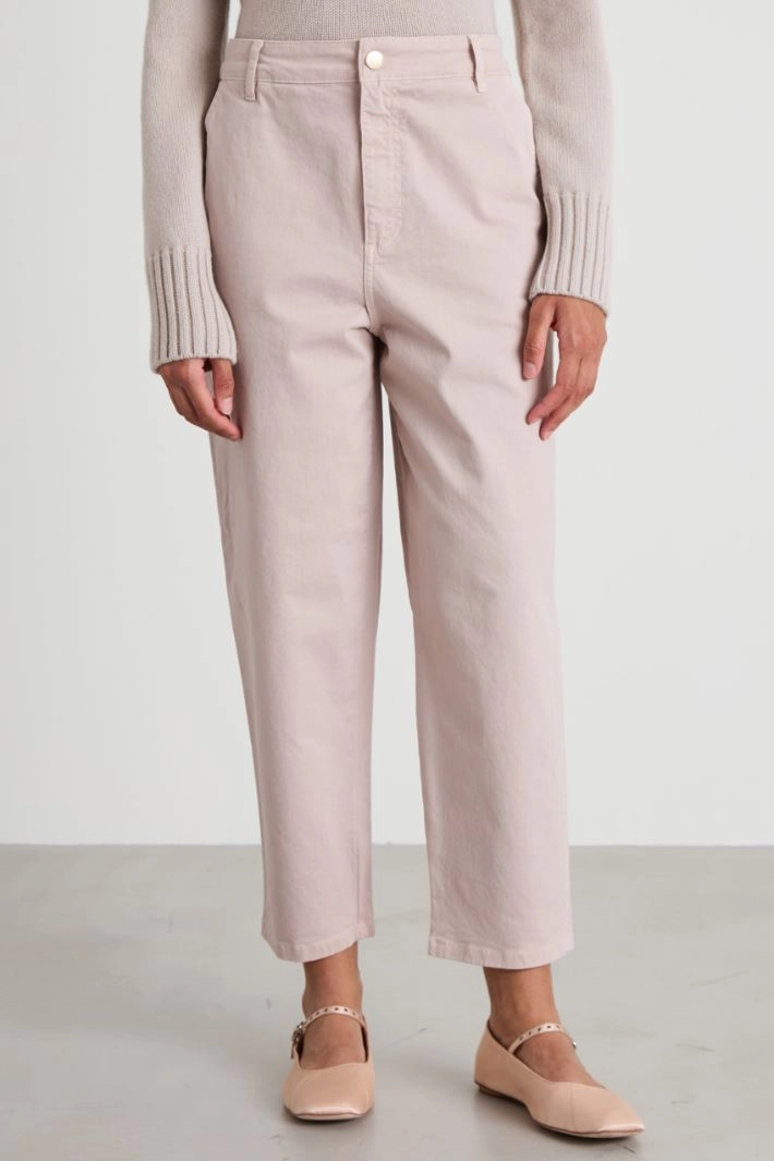 Pantaloni boyfriend realizzati in drill di cotone stretch, con passanti in vita, tasche alla francese davanti e tasca applicata con patta dietro. Allacciatura tramite zip e bottone a pressione.