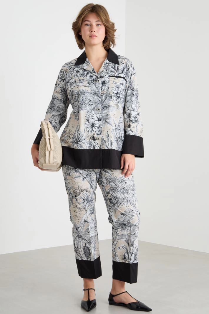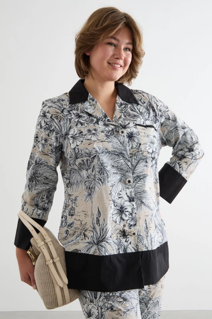 Casacca dalla linea dritta in popeline di cotone stretch stampato, con colletto a punta, tasca applicata sul petto, maniche lunghe e inserti a contrasto. Chiusura con bottoni gioiello.