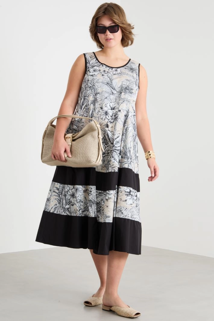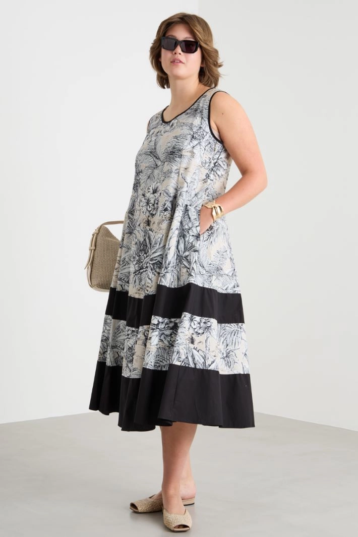 Abito midi dalla linea svasata in popeline di cotone stampato, con scollo tondo, spalline larghe, tasche inserite in cucitura e inserti in popeline stretch a contrasto. Chiusura con zip sul retro.