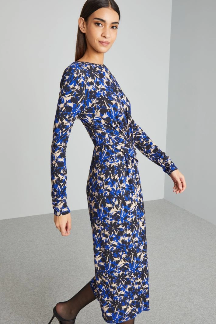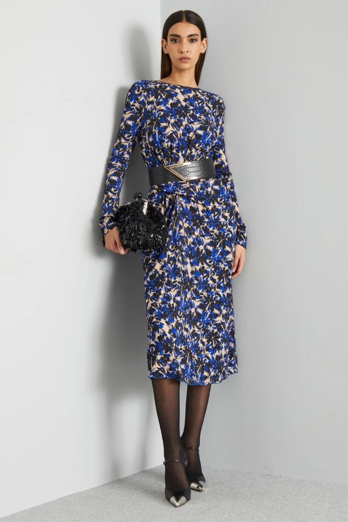 Abito a tubino realizzato in jersey crépe di viscosa stretch stampato, con scollo a giro sul davanti e a V nel retro, maniche lunghe e motivo annodato sul fianco.