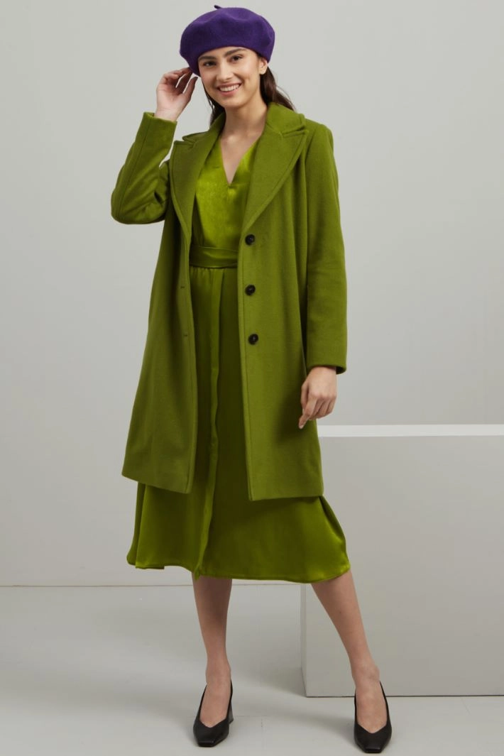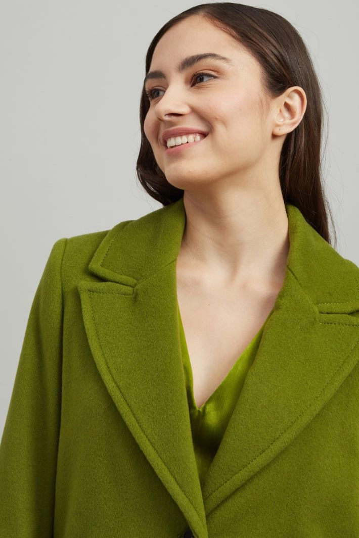 Cappotto dalla linea dritta realizzato in drap di misto lana, con collo rever, maniche lunghe e tasche inserite in cucitura, profili rifiniti a puntino. Allacciatura monopetto tramite bottoni a vista. Foderato.