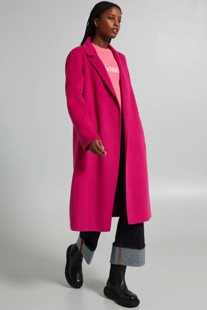 Cappotto lungo dalla linea dritta realizzato in doppio panno di misto viscosa stretch, con collo a rever, maniche lunghe, tasche laterali a filettone e allacciatura tramite cintura coordinata. Capo sfoderato.