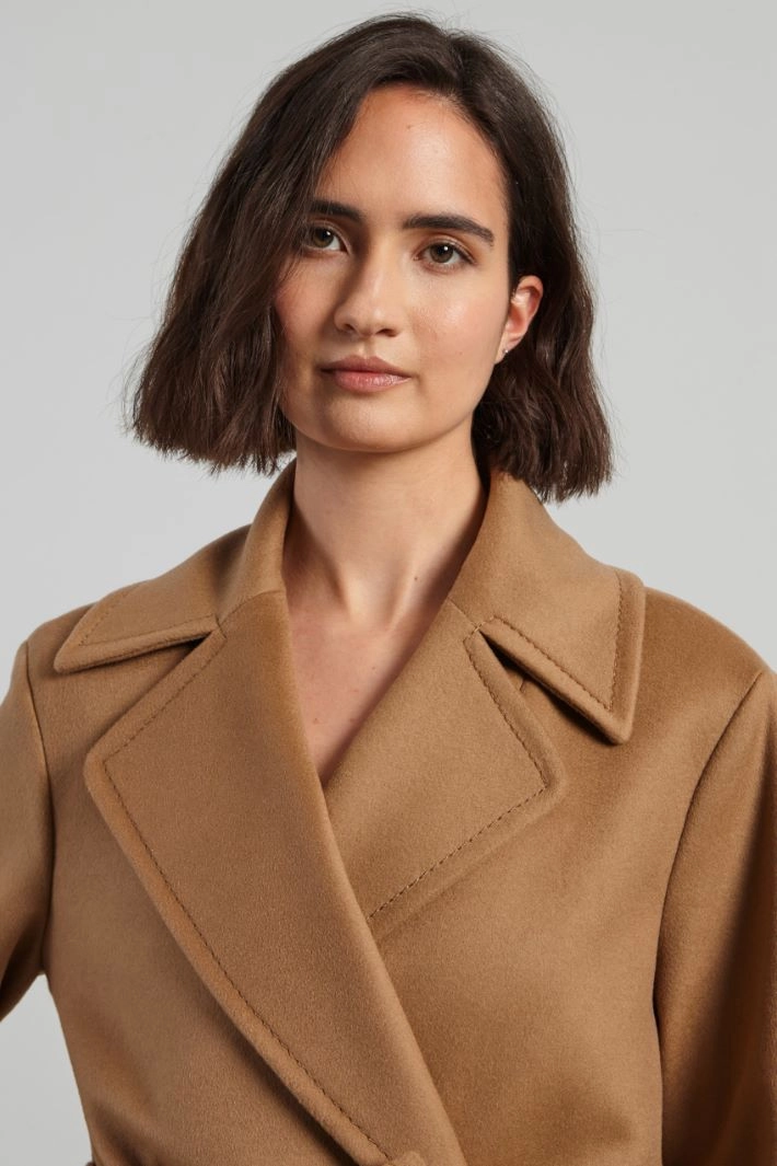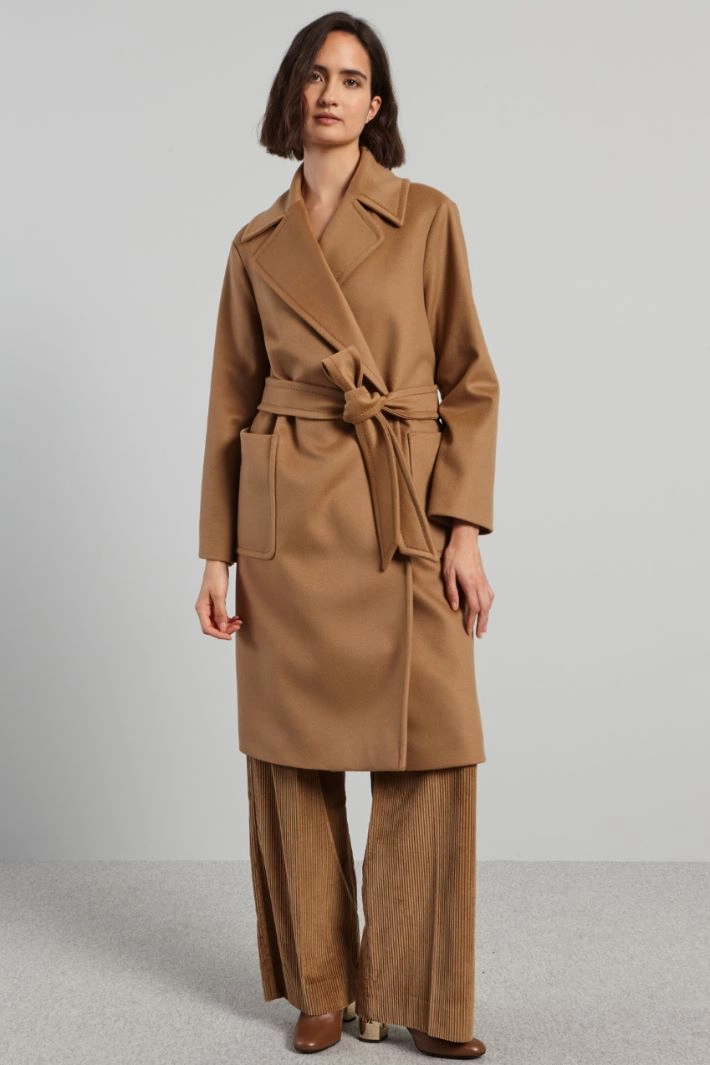 Cappotto dalla linea dritta realizzato in drap di pura lana, con collo a rever, maniche lunghe e maxi tasche applicate. Allacciatura tramite cintura coordinata. Foderato.