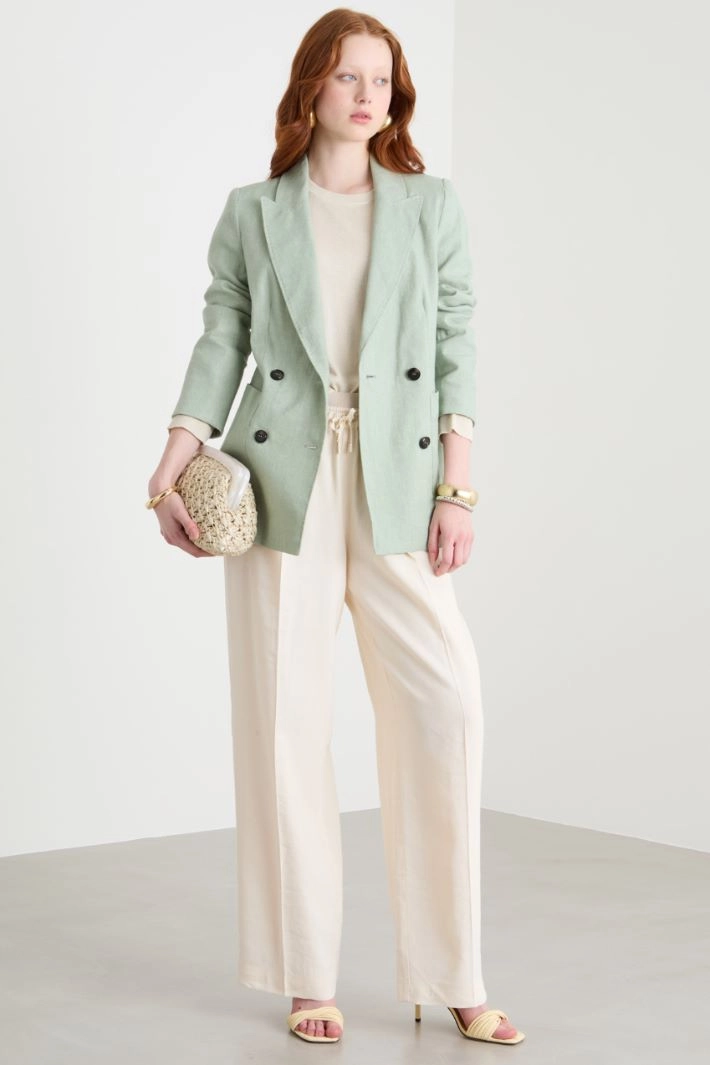 Blazer dalla linea dritta in lino e cotone stretch a tessitura diagonale, con rever a lancia, maniche lunghe, spacchi con bottoni ai polsi, tasche applicate, spacco sul retro. Capo foderato. Chiusura con bottoni.