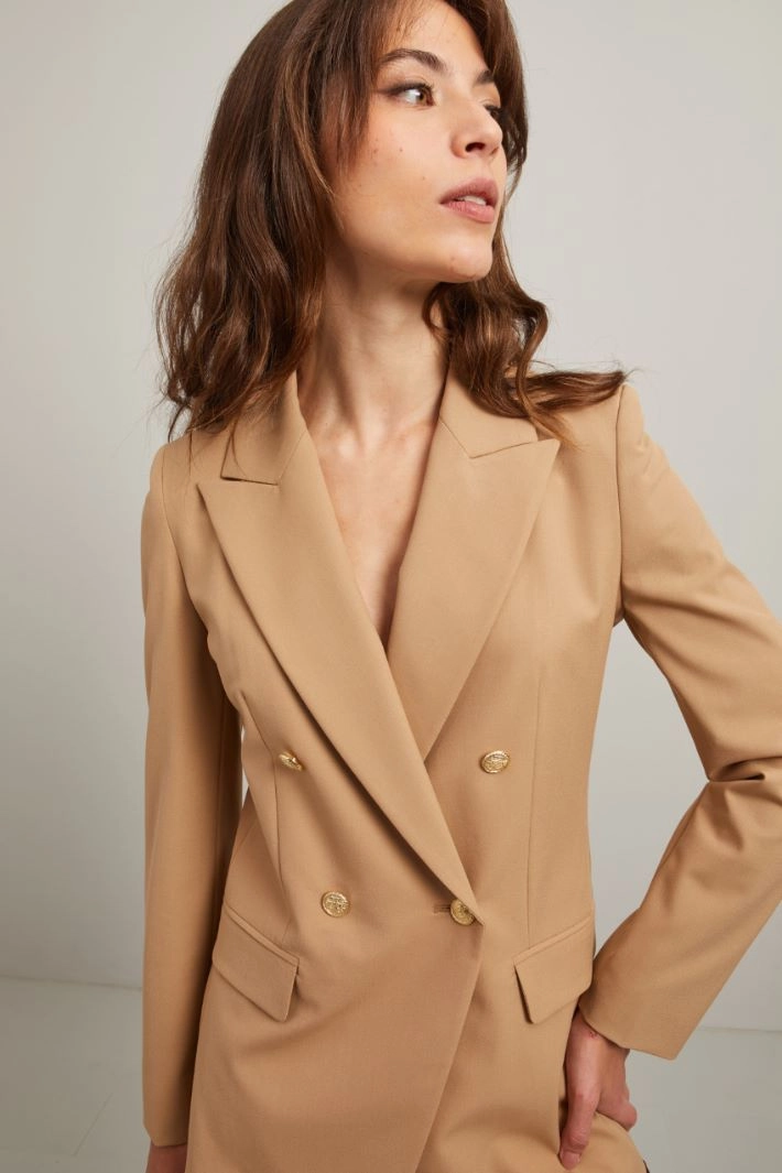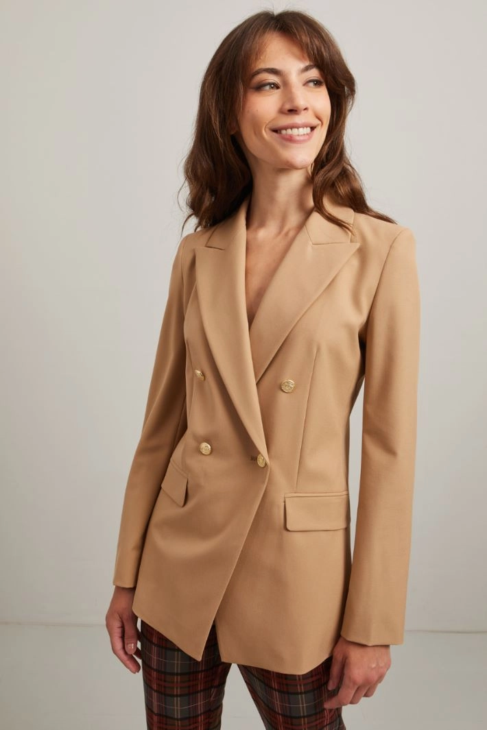 Blazer dalla linea dritta realizzato in tela di misto viscosa stretch, con collo a rever, maniche lunghe con spacchetto e bottoni al fondo, tasche a doppio filetto con patta, spacco nel retro, profili rifiniti a puntino e allacciatura doppiopetto tramite bottoni. Foderato.