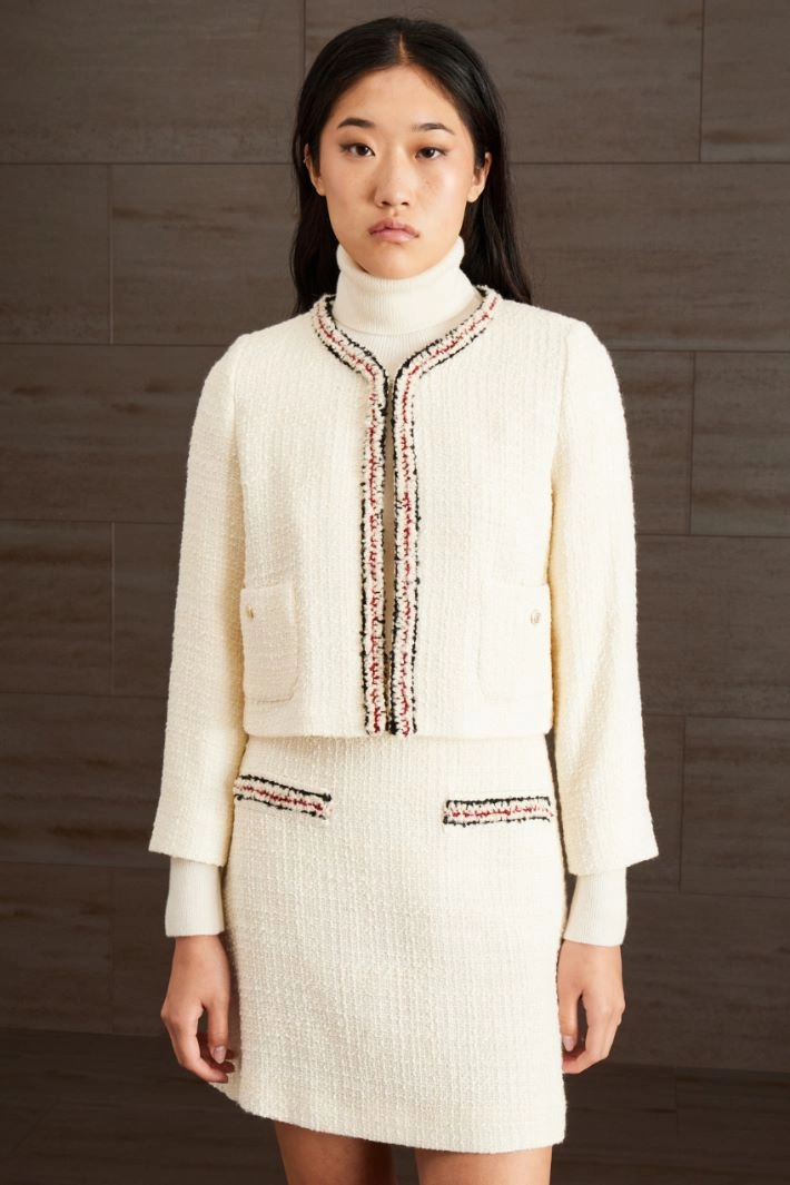 Giacca corta dalla linea dritta realizzata in tweed di misto lana, con scollo rotondo, maniche lunghe, dettaglio di bordo in passamaneria bouclè, taschini applicati con bottone sul davanti e allacciatura tramite gancio. Capo sfoderato.