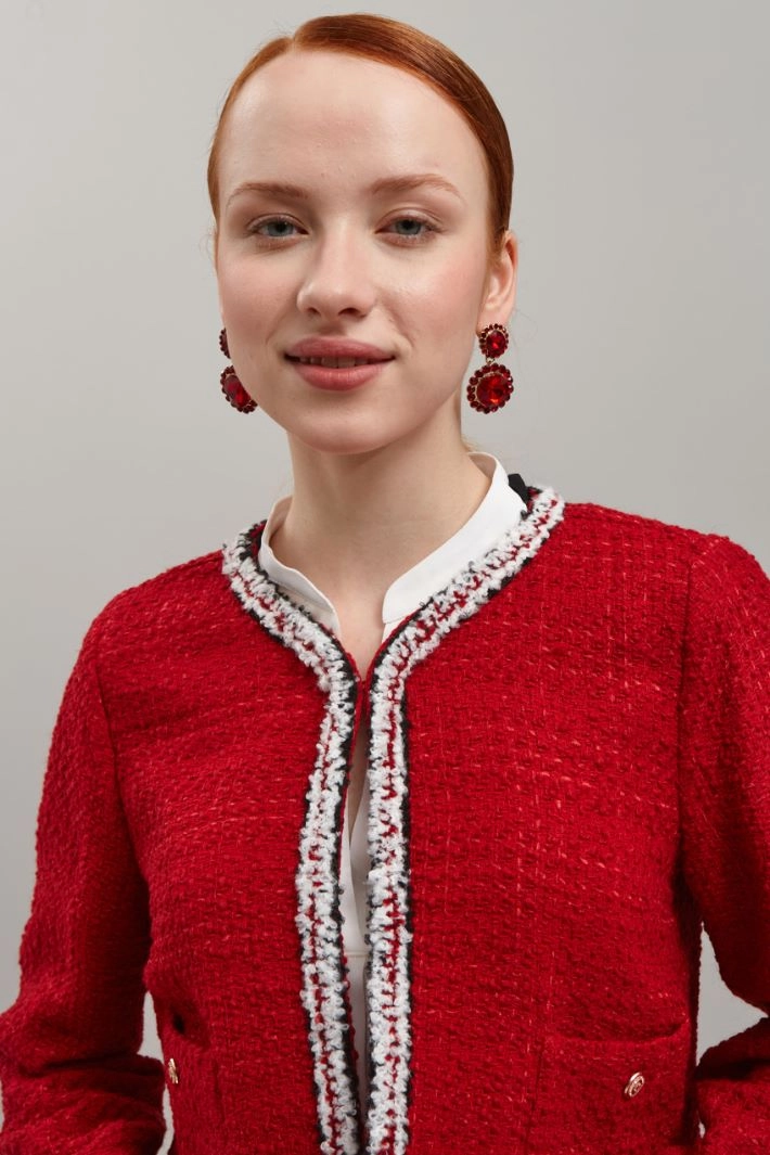 Giacca corta dalla linea dritta realizzata in tweed di misto lana, con scollo rotondo, maniche lunghe, dettaglio di bordo in passamaneria bouclè, taschini applicati con bottone sul davanti e allacciatura tramite gancio. Capo sfoderato.