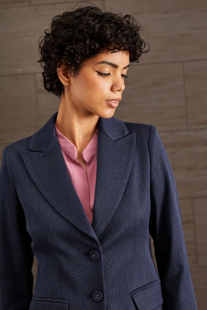 Blazer dalla linea semiaderente realizzato in tessuto di misto cotone e viscosa stretch tinto filo, con collo a rever, maniche lunghe, tasche a doppio filetto con patta e allacciatura monopetto tramite bottoni. Foderato.