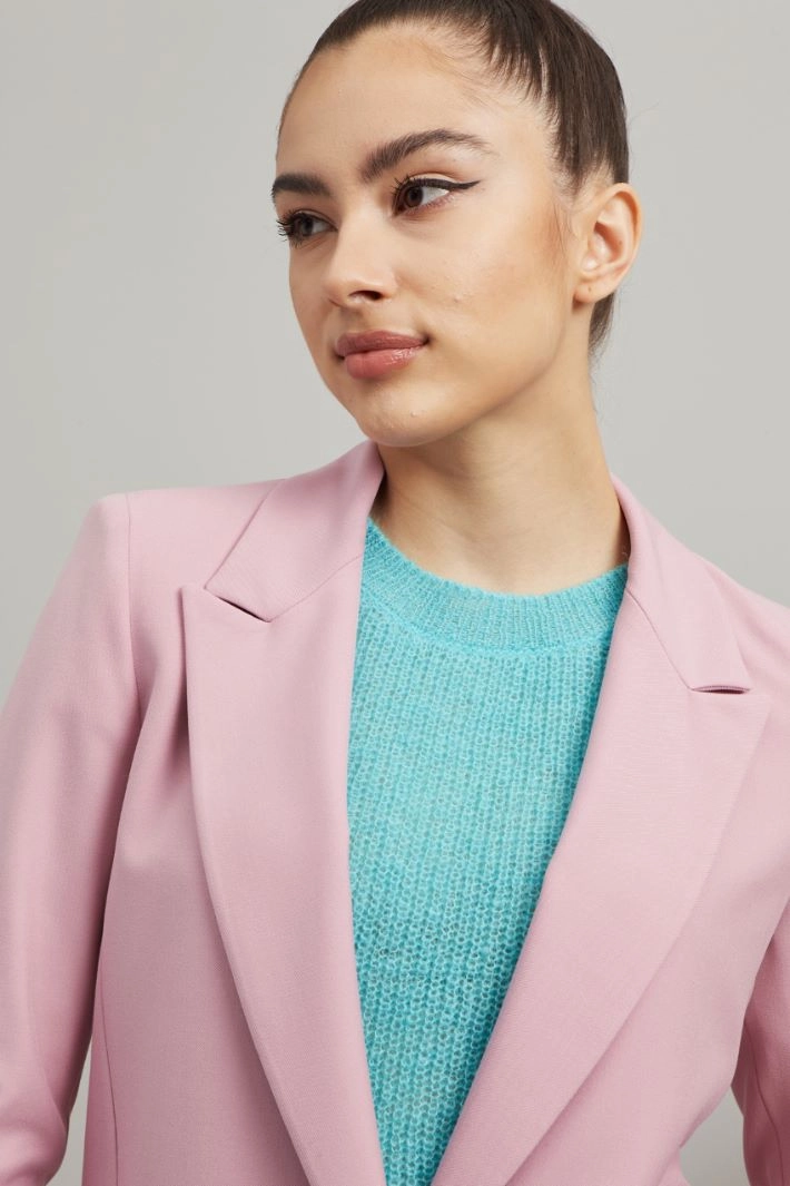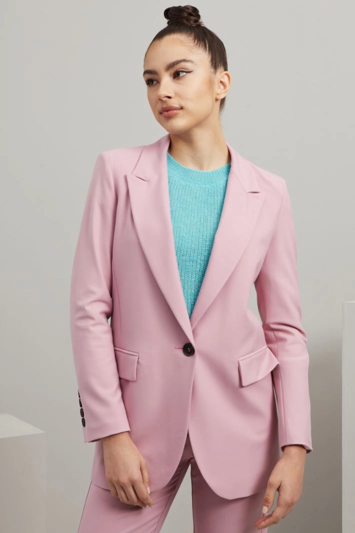 Blazer dalla linea dritta realizzato in tessuto di misto viscosa stretch tinto filo, con collo a rever, maniche lunghe con spacchetti e bottoni al fondo, tasche a filetto con patta e spacco nel retro. Allacciatura monopetto tramite bottone.
