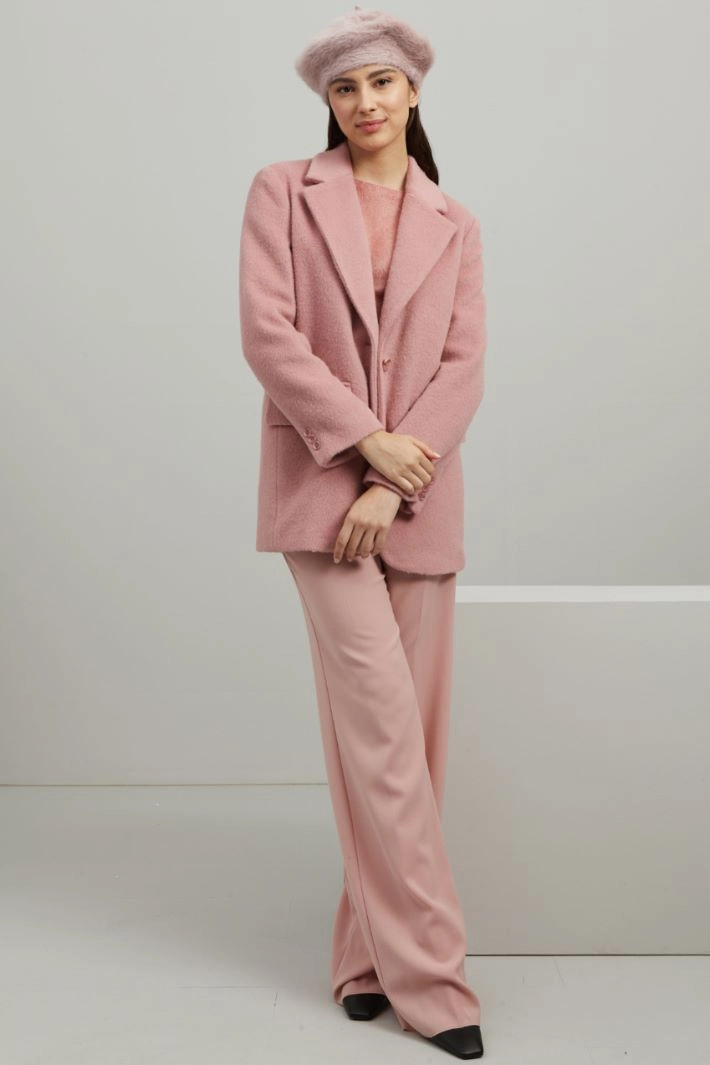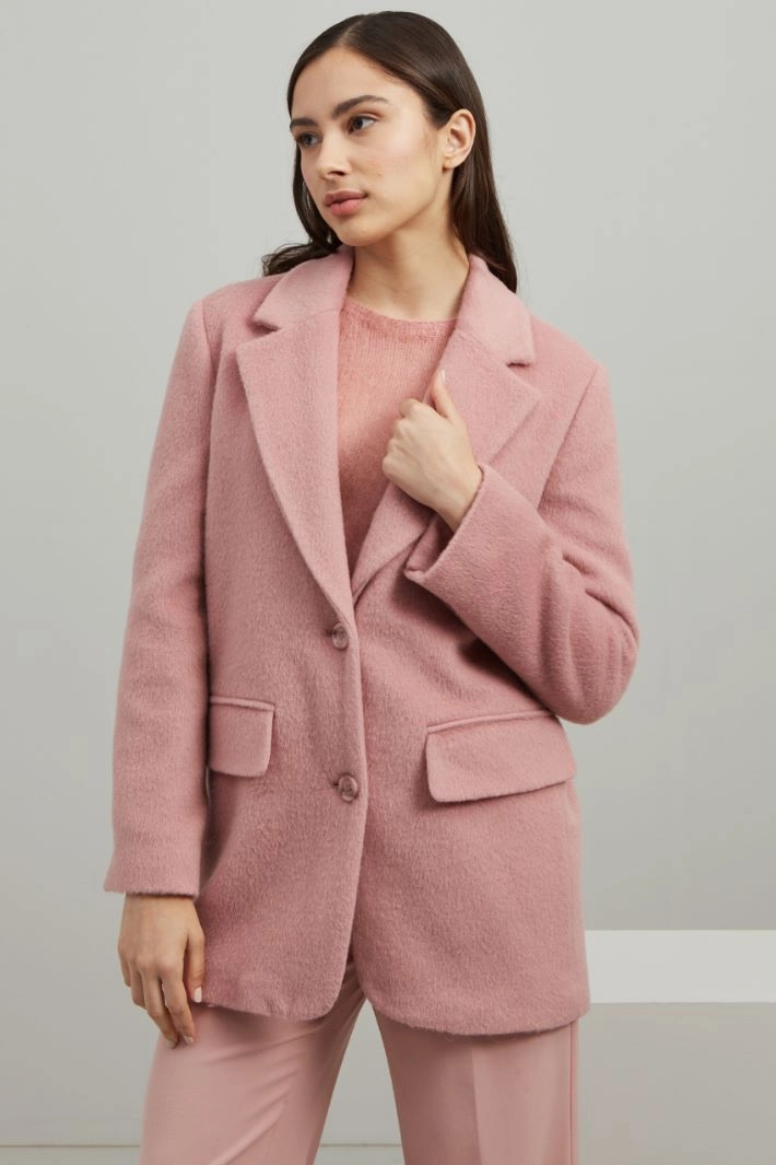 Blazer dalla linea dritta realizzato in misto lana, alpaca e mohair con collo a rever, maniche lunghe con spacchetto e bottoni, maniche a filetto con patta. Allacciatura tramite bottoni a vista. Foderato.