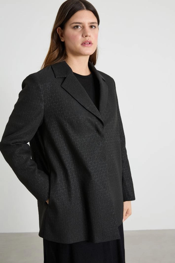 Blazer dalla linea svasata realizzato in tessuto jacquard di misto viscosa lamè, con collo a rever, maniche lunghe, tasche laterali inserite in cucitura e allacciatura monopetto nascosta tramite ottoni automatici. Capo semifoderato.