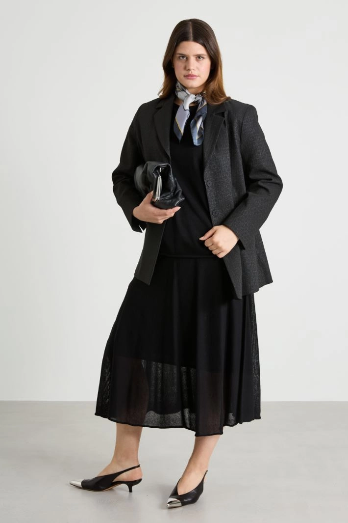 Tessuto 60% poliestere, 32% viscosa, 8% fibra metallizzata; fodera 57% viscosa, 43% poliestere.
