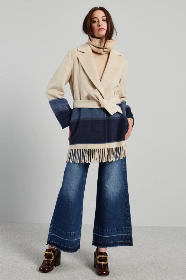 Cappotto dalla linea dritta realizzato in drap di misto lana tinto filo, con collo a rever, maniche lunghe, tasche laterali inserite in cucitura e motivo di frange al fondo. Allacciatura tramite cintura coordinata. Capo semifoderato.