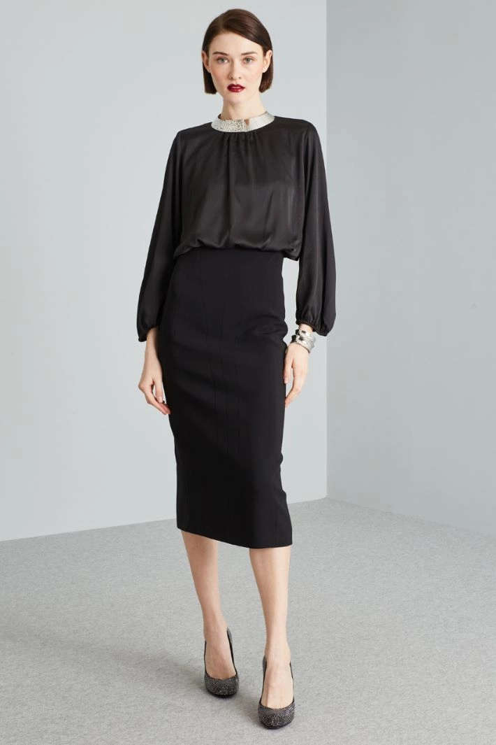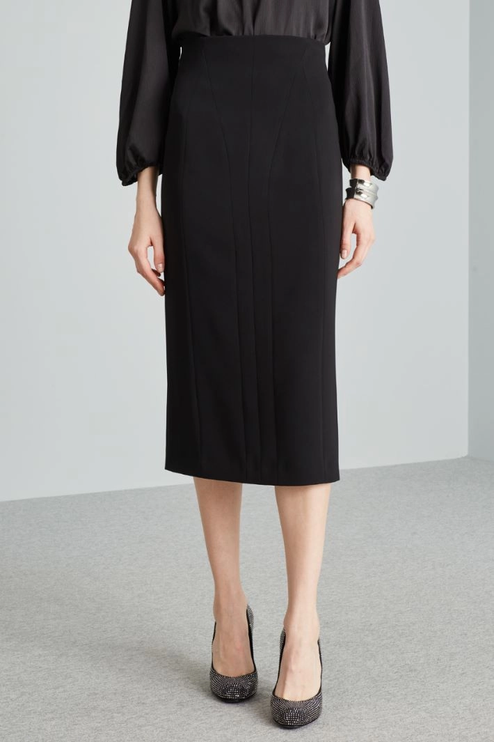 Gonna a tubino realizzata in cady fluido, con spacco centrale e allacciatura tramite zip invisibile e gancio sul retro. Capo foderato.