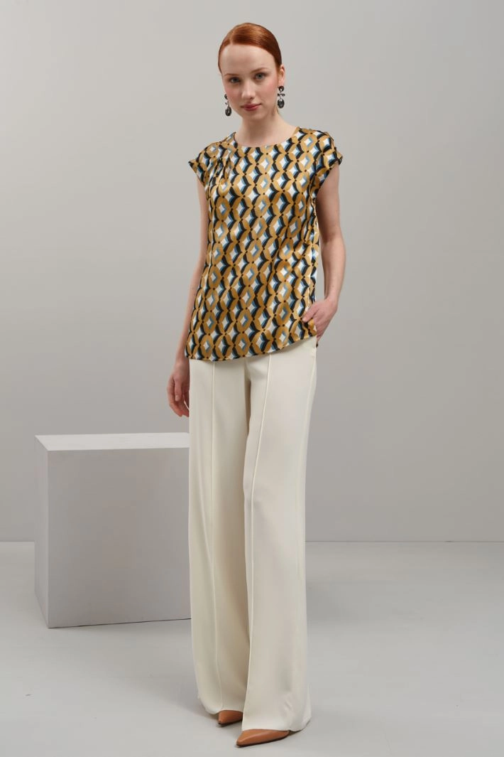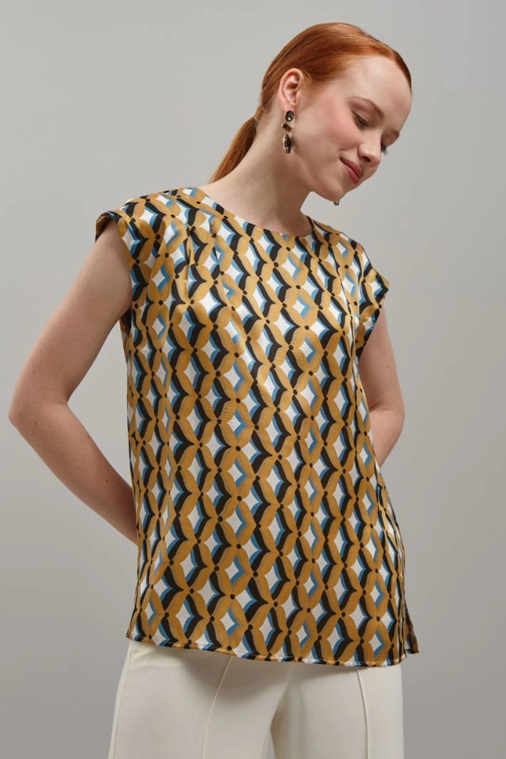 Top dalla linea dritta in raso di pura seta stampata, con scollo rotondo, maniche ad aletta. Apertura a goccia con bottone sul retro.